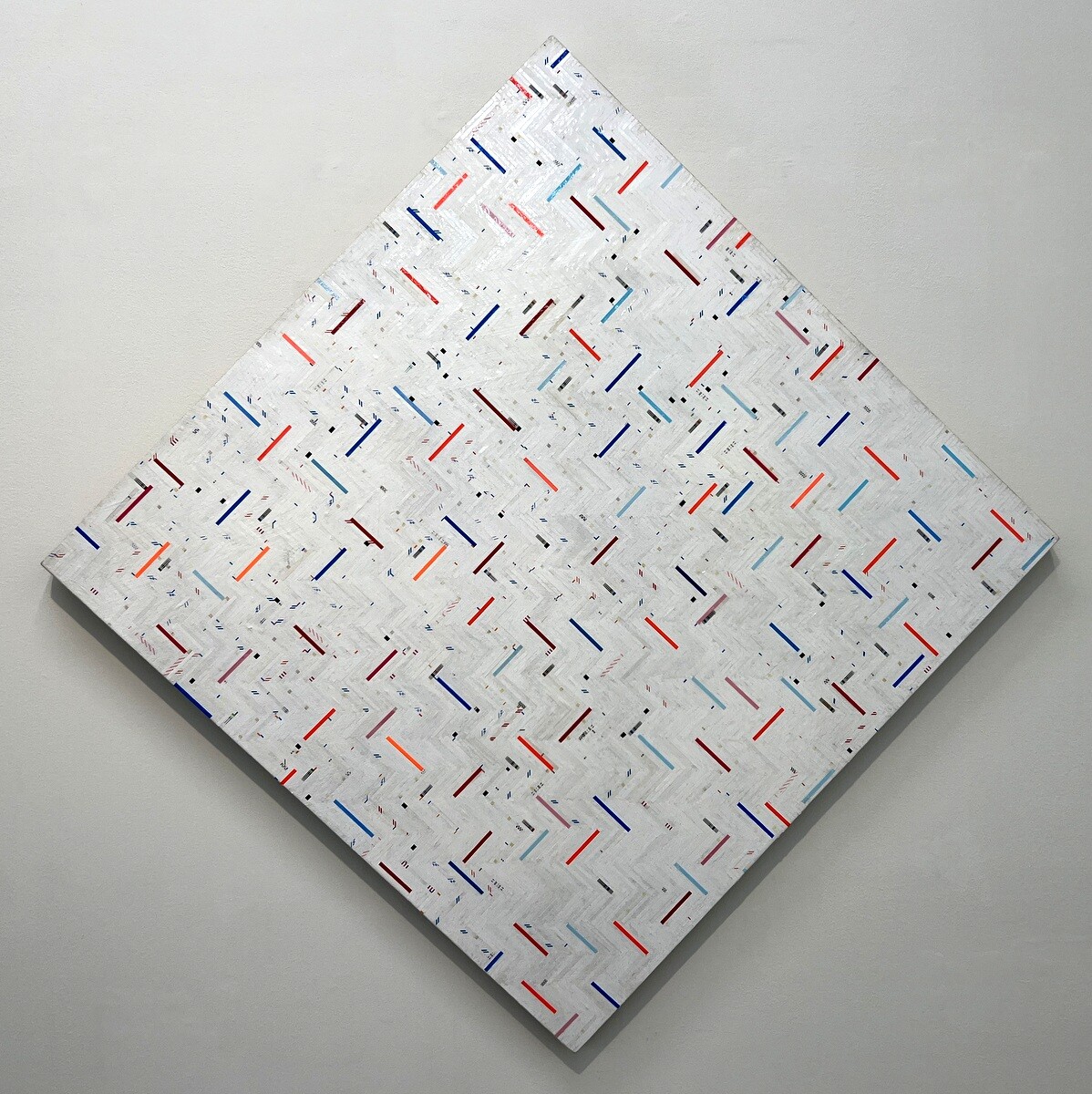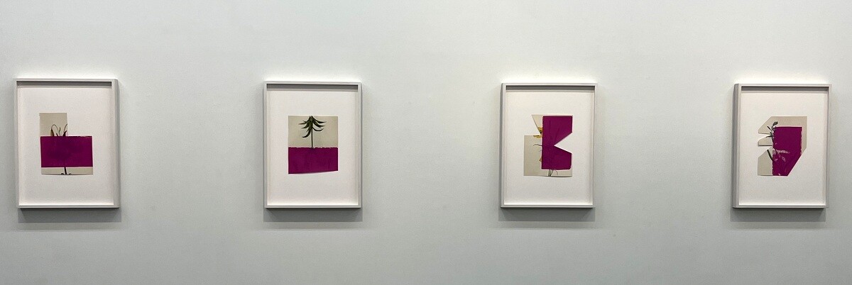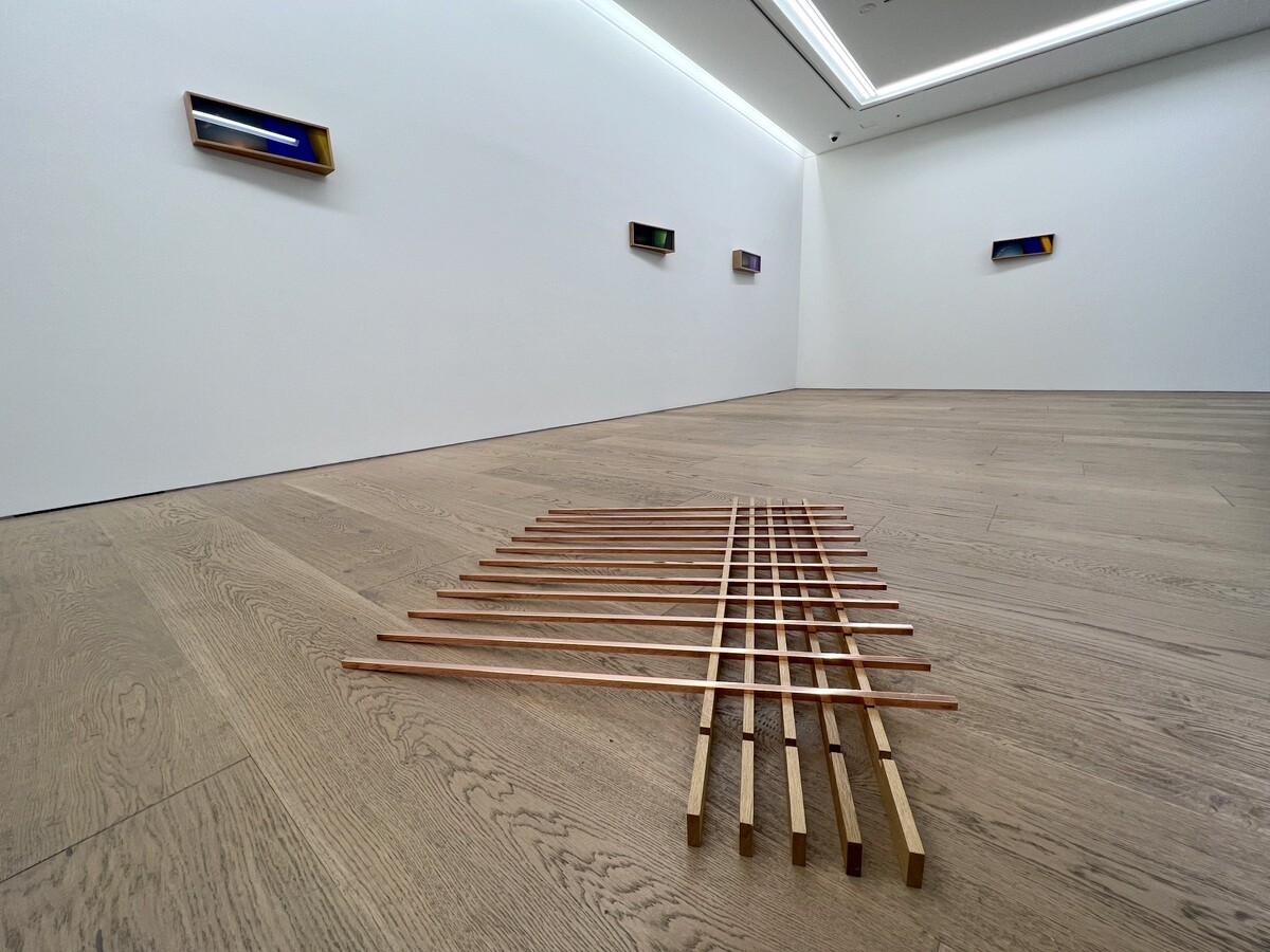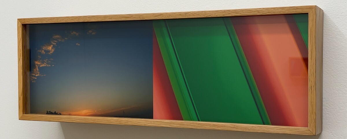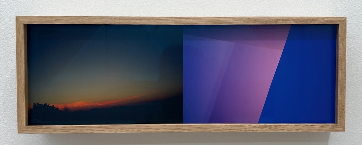 ディプティク(二連画)という形で構成されており、各構図の左側はテキサス州西部の地平線から光放つ朝日を、右側はダン・フレイヴィン氏の光のインスタレーション「Intitled (Marfa Project)」(1996年)から得た自身の知覚体験を抽象化し、フレームに収めているとのこと。ヒューイット氏が自らデザイン した木箱のなかに構成されたフレームは、左右で異なる奥行きとなっており、各作品に特有のアングルを与えている。