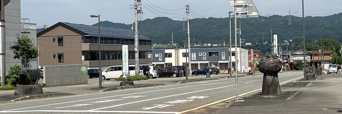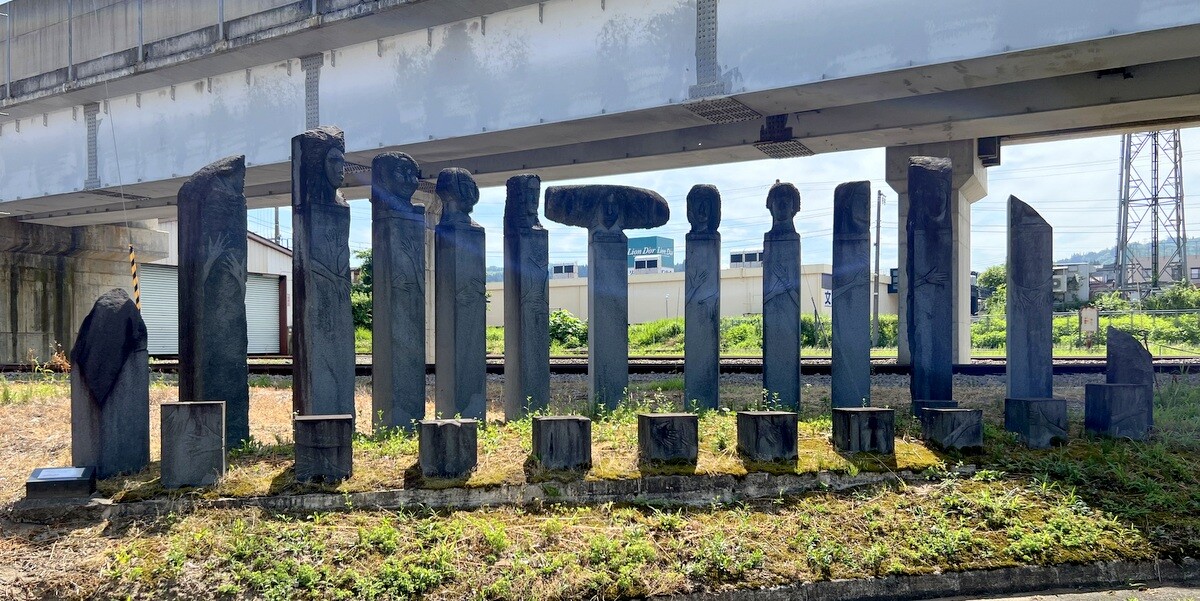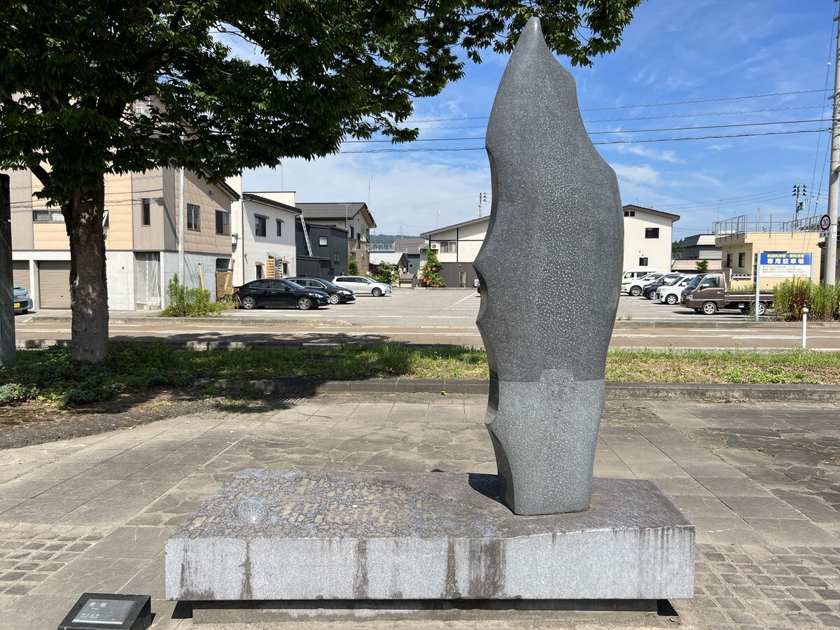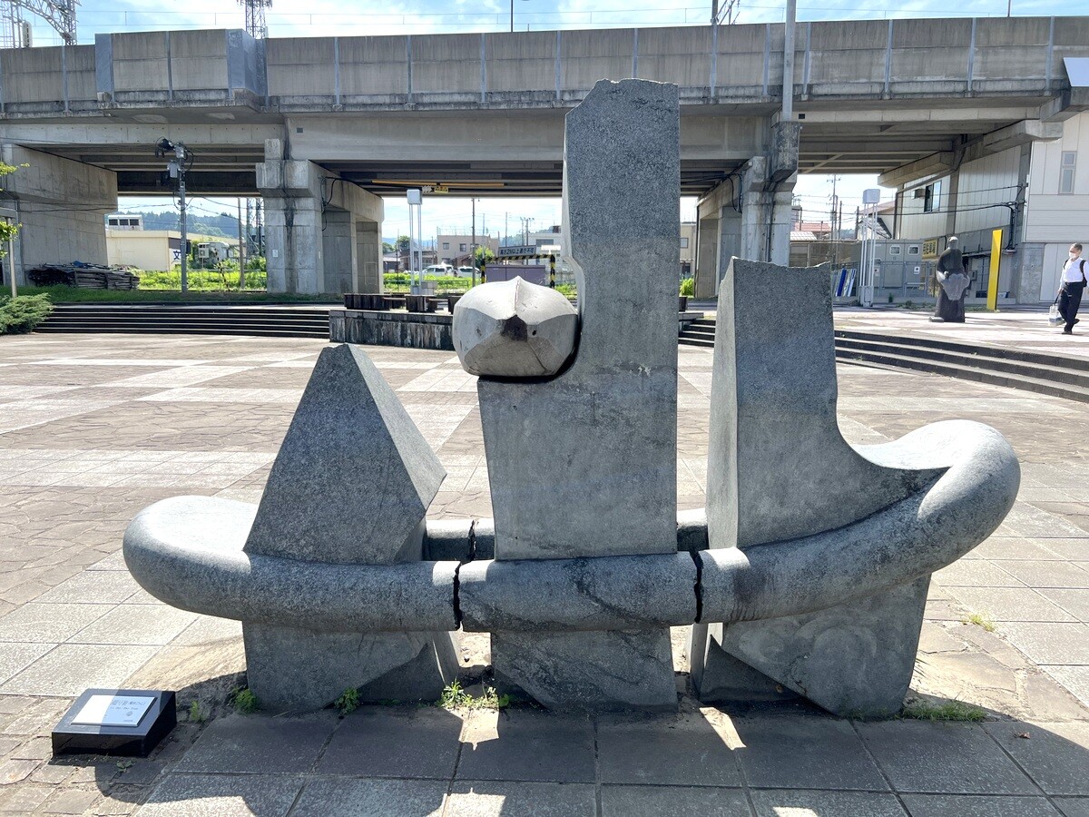 JR飯山線・北越急行ほくほく線十日町駅前の西口は、とても静かなのだが、色々な彫刻が多数あり、駅前に通じる広い通りの両側にも、いくつもの彫刻があった。