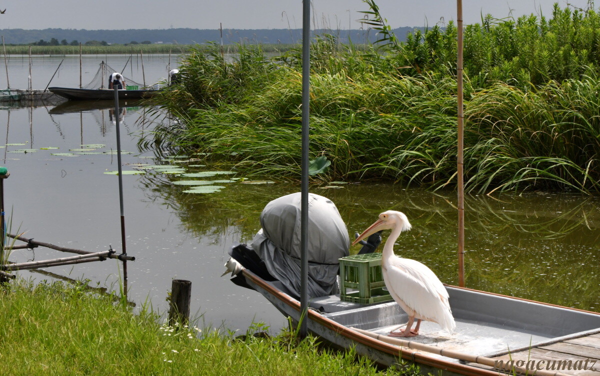 全く知らなかったのだが、印旛沼と言えばカンタ君なるモモイロペリカンが人気者とのこと。ある漁師さんのボートの所に今日も居るから行ってごらん、と近くの人に教えてもらい行ってみると・・・