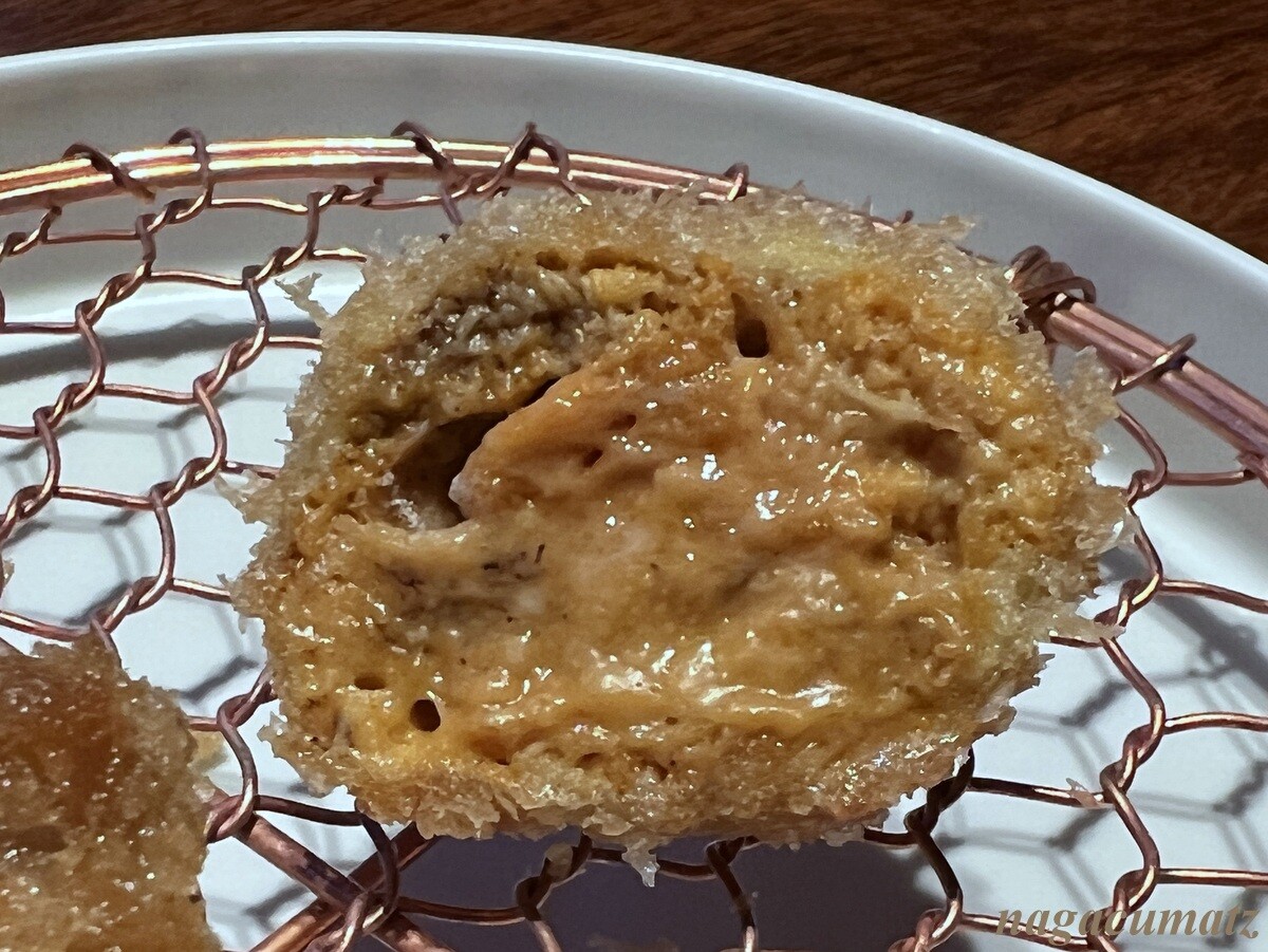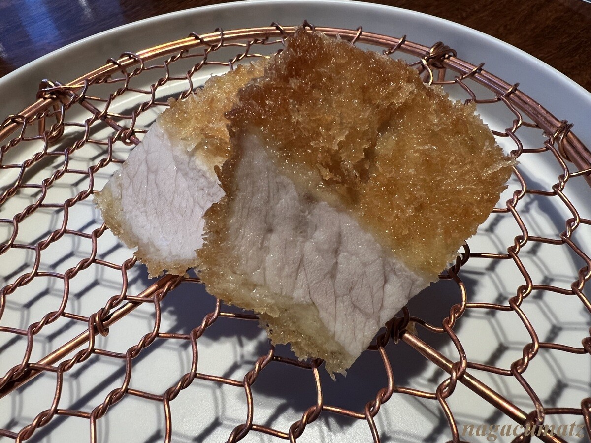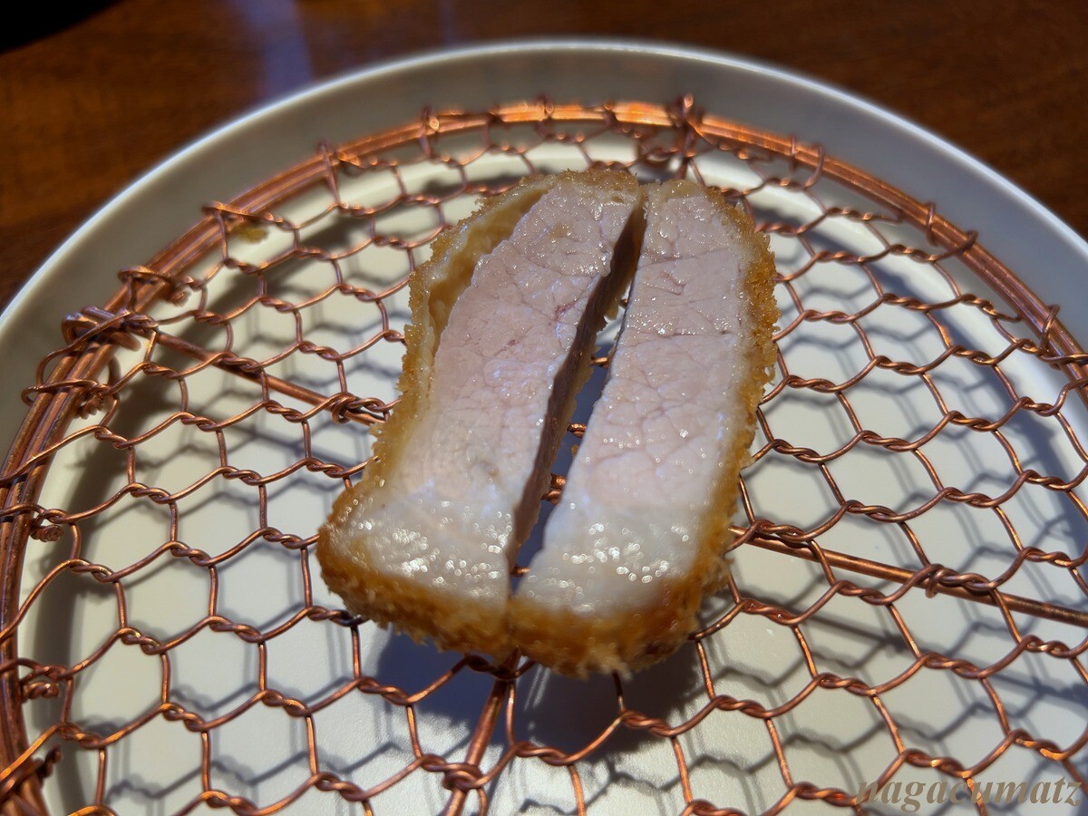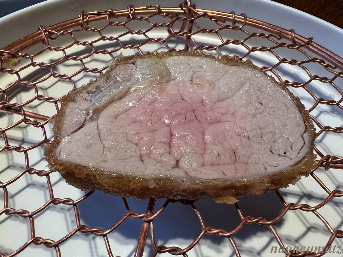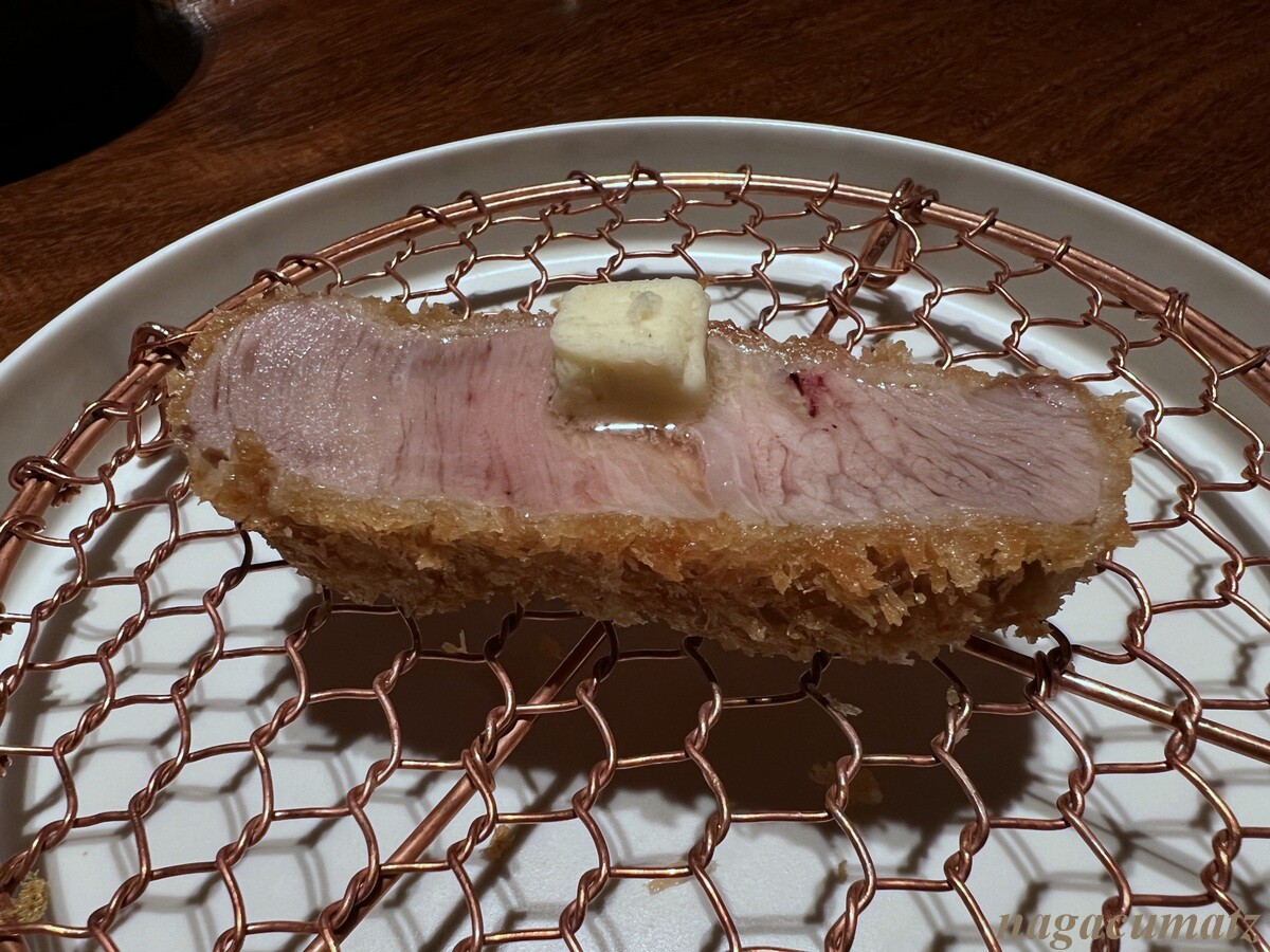 本日のロース系カツの二つ目は、肩ロース。ロース、リブロース、肩ロースの3つの中で最も旨味が濃厚とのこと。自家製のトリュフバターを載せていただく。トリュフの香りがぷんぷん。