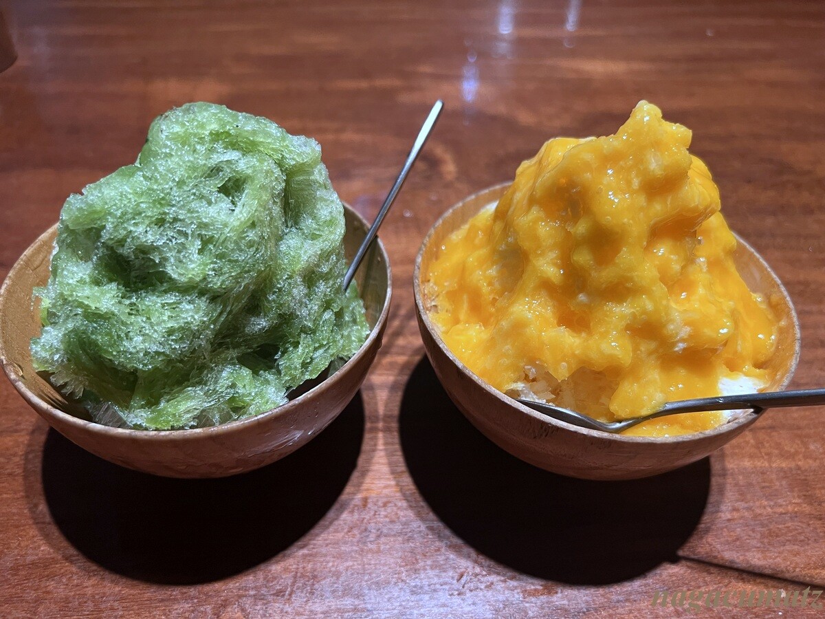 デザートも6種類のかき氷からの選択で、抹茶とマンゴーミルクを。自家製シロップとのことで、マンゴーミルクと比べると、抹茶は甘さ控え目。