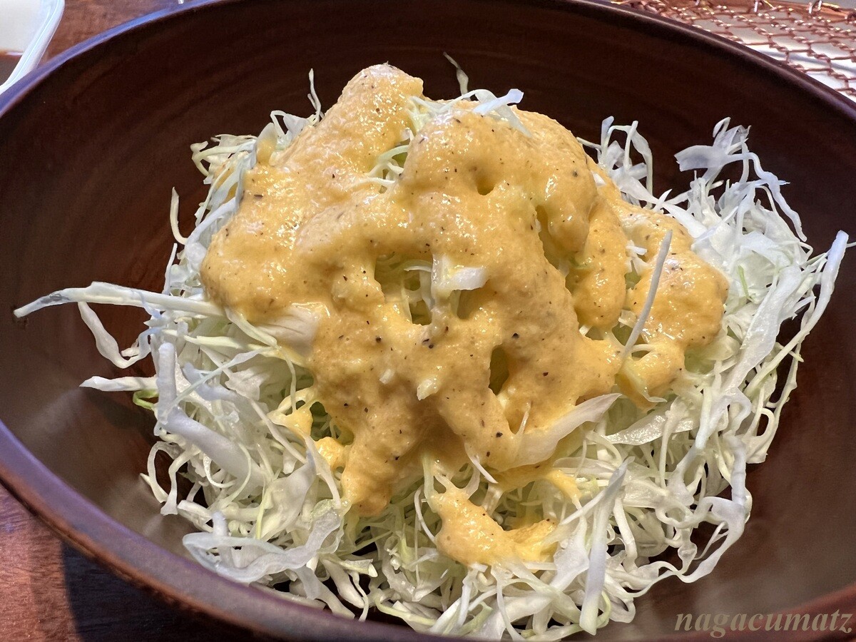 キャベツには、自家製の人参などの入ったドレッシングを自分で適宜かける。