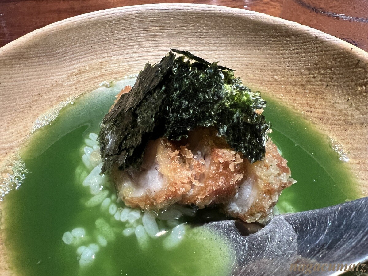 お茶漬けと言っても、上にしっかりカツや海苔が載り、抹茶の入ったお茶となっている。