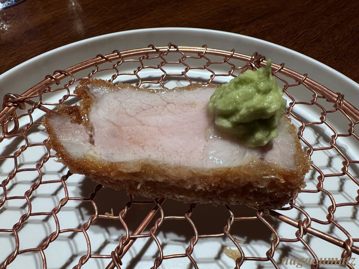 本日のロース系カツの一つ目には、安曇野の山葵をてんこ盛り。それを全面に塗って、まず脂身の方から食べるようにと。