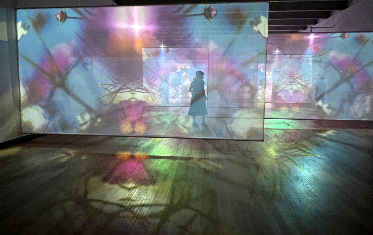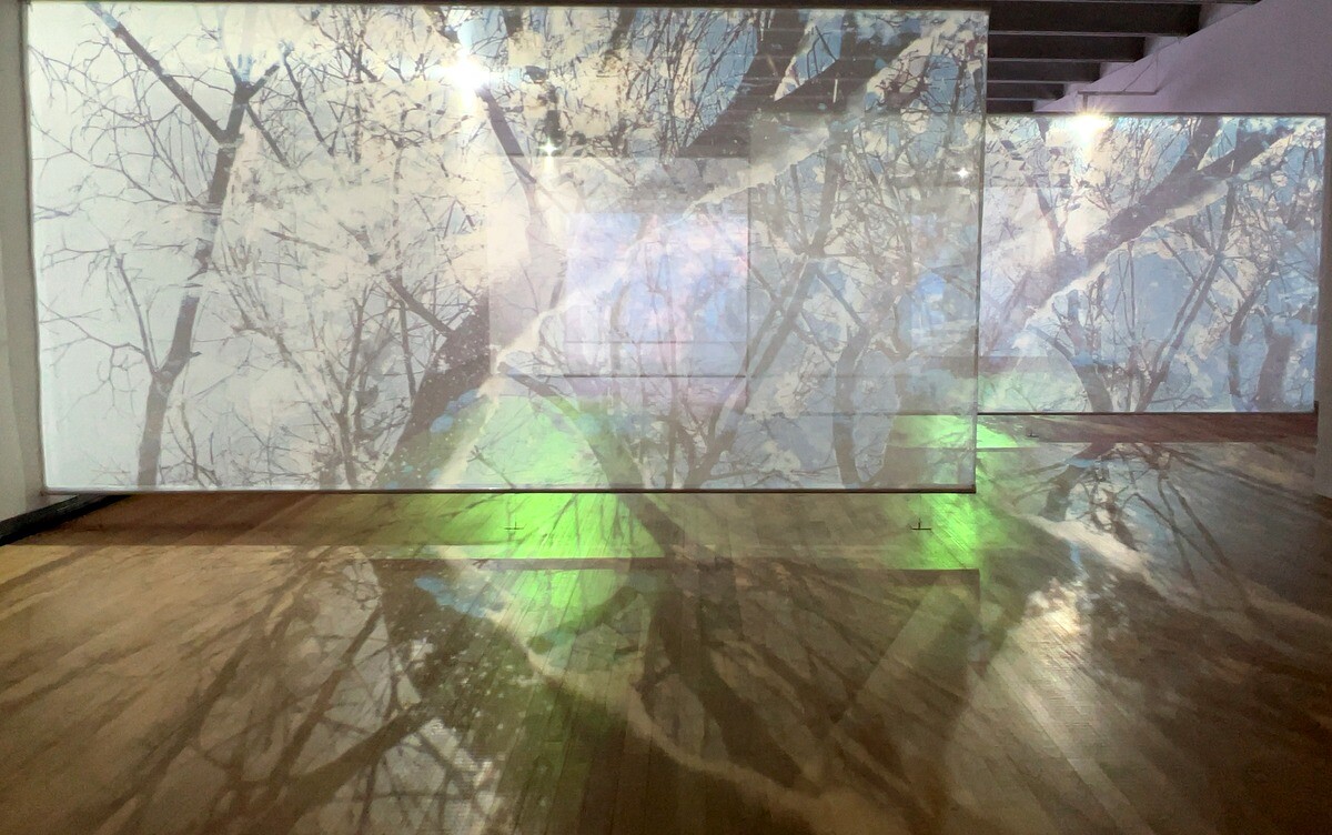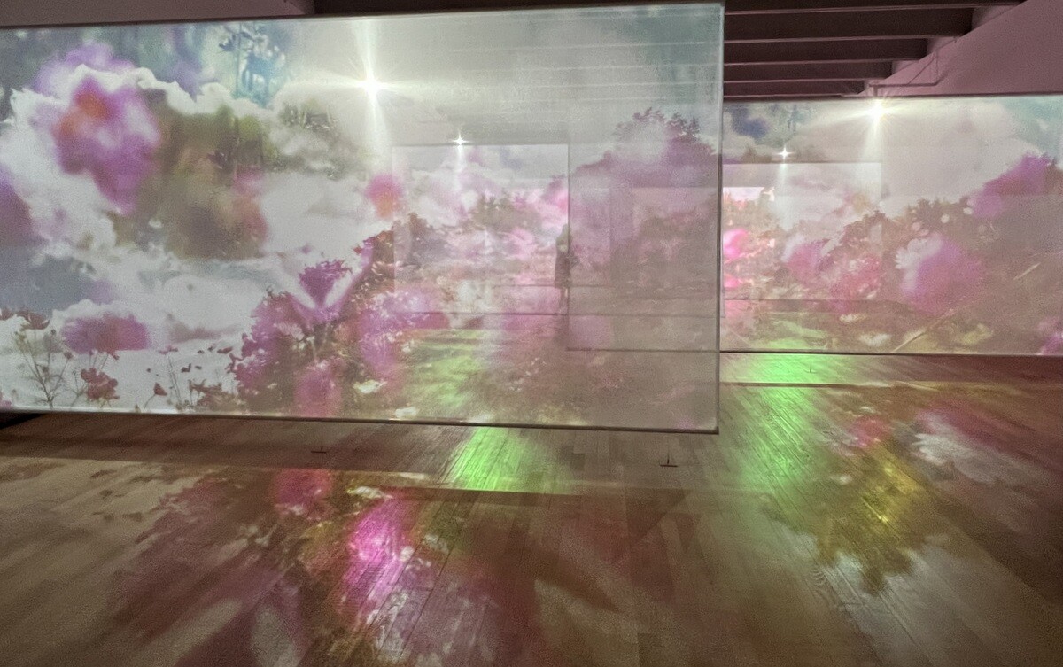 鑑賞者は映し出されるスクリーンと反射する床などを楽しみつつ、スクリーンの間を回遊できて楽しい。