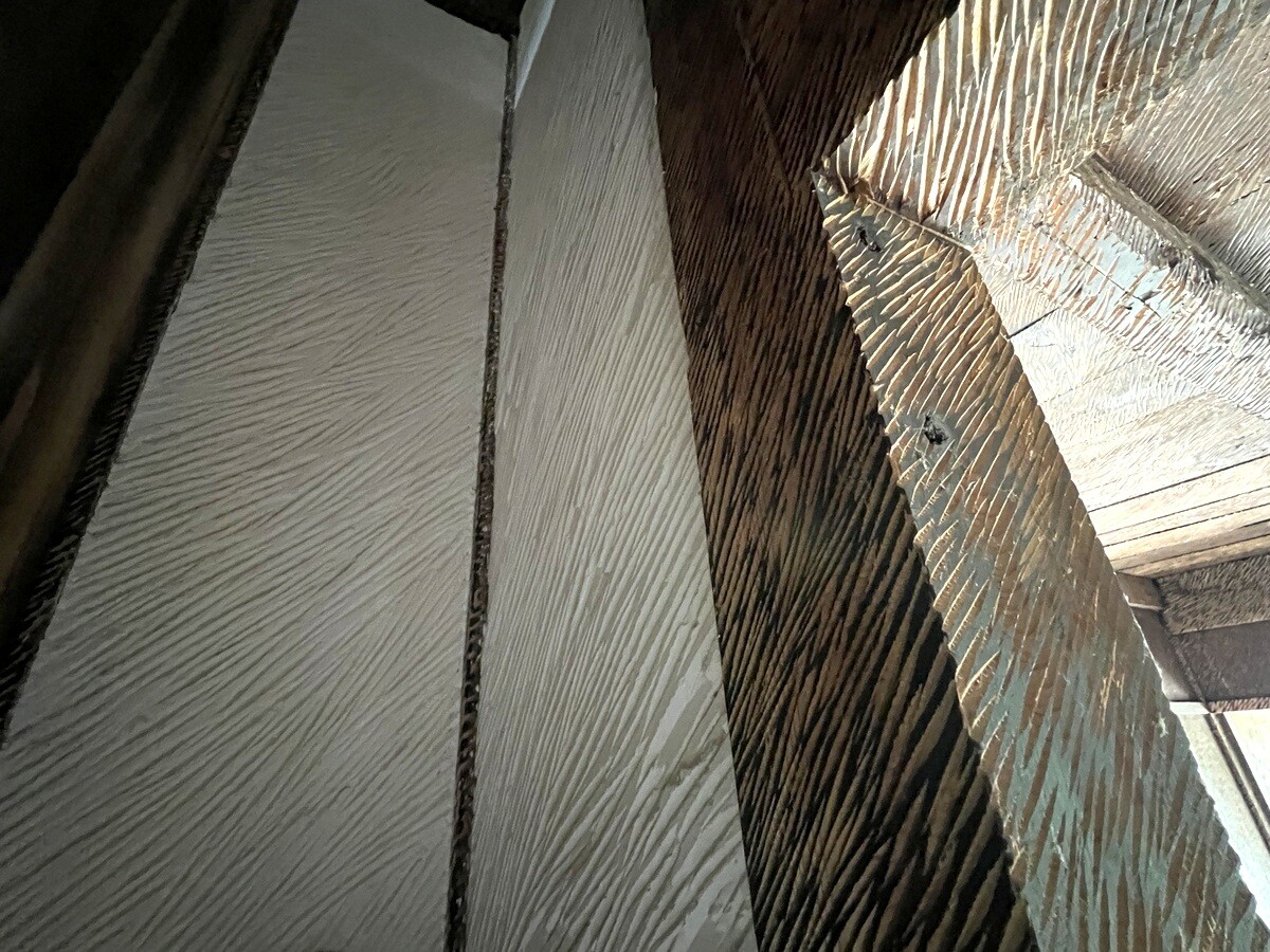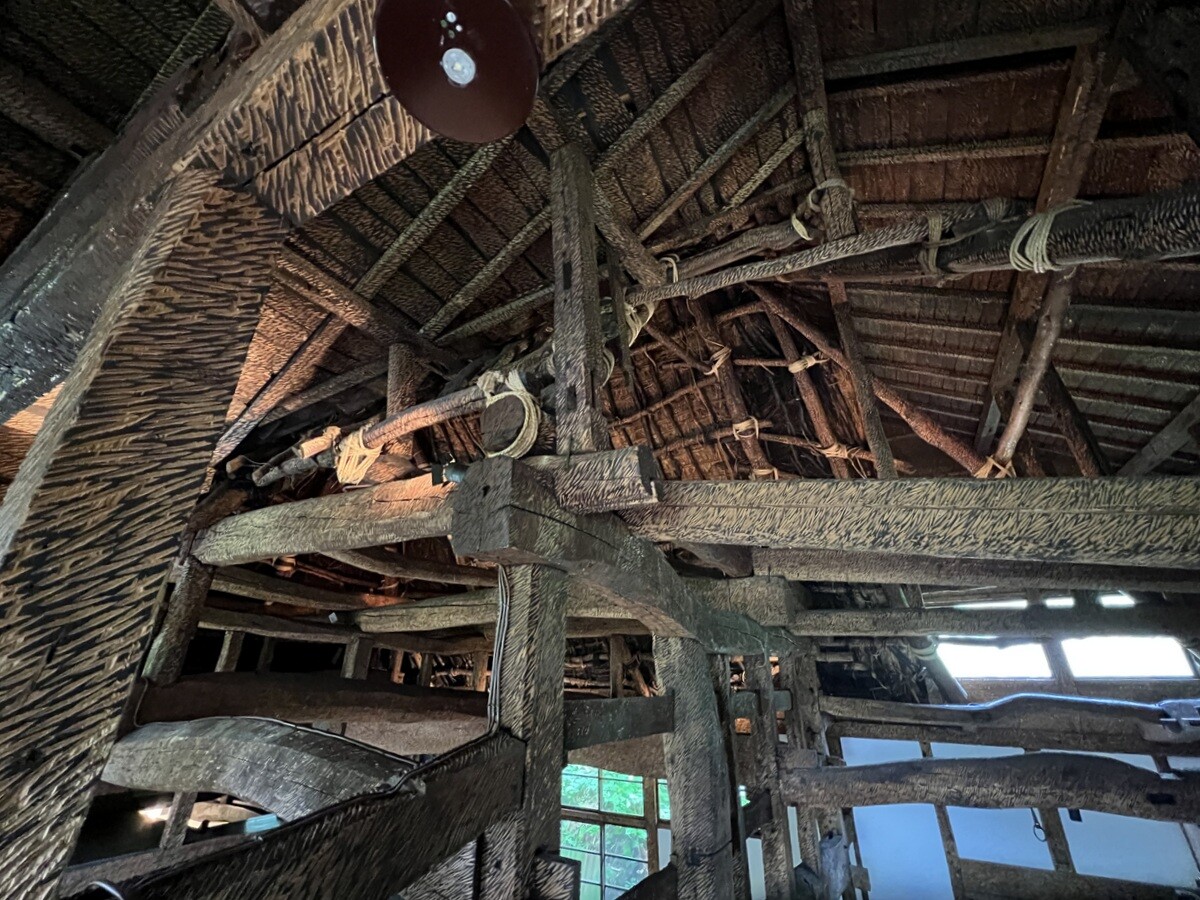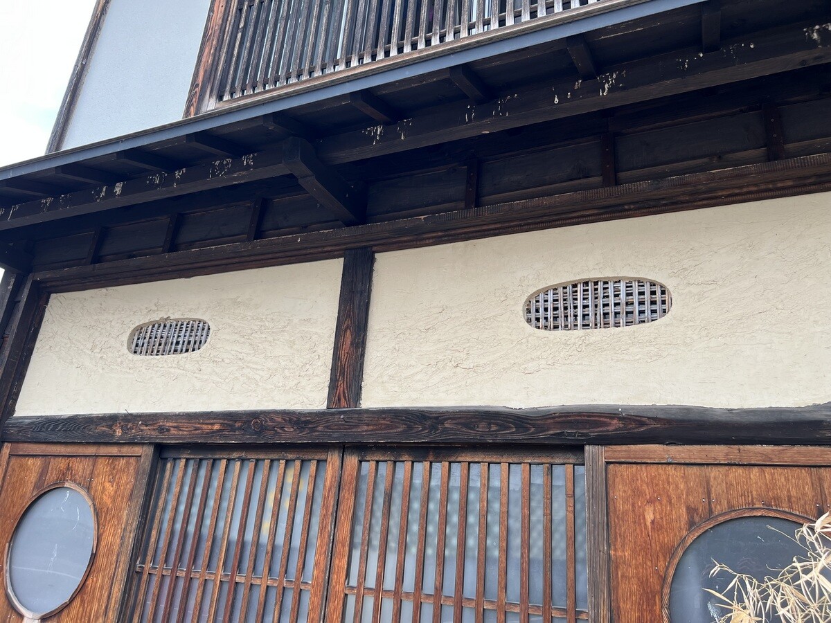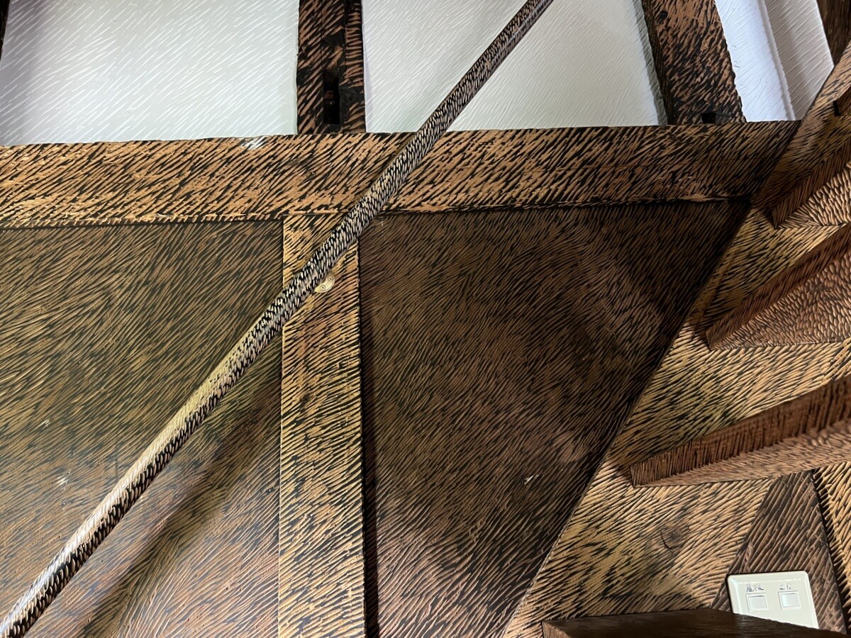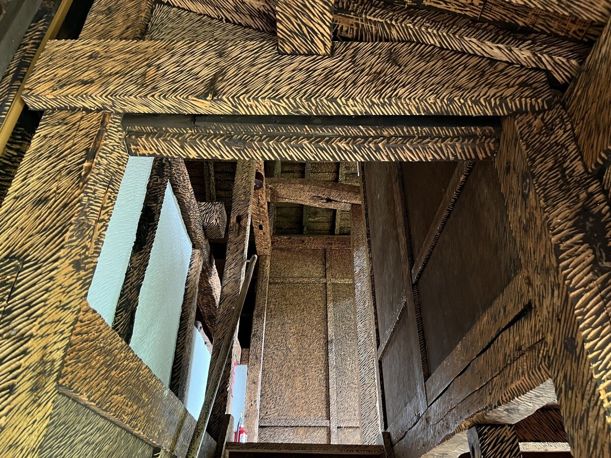 木材には、ベンガラ(土中の鉄が酸化した酸化第二鉄を主成分とする顔料)と、柿渋(まだ青いうちに収穫した渋柿の未熟果を搾汁し発酵熟成させたもので、日本では古くからこの柿渋を塗料や染料、あるいは万能民間薬としている)を予め塗ってあるところを彫っているのだそう。漆喰の部分にも彫られている。二階建ての高い屋根の梁部分などは、家の中に足場を組んで彫って行ったとのこと。