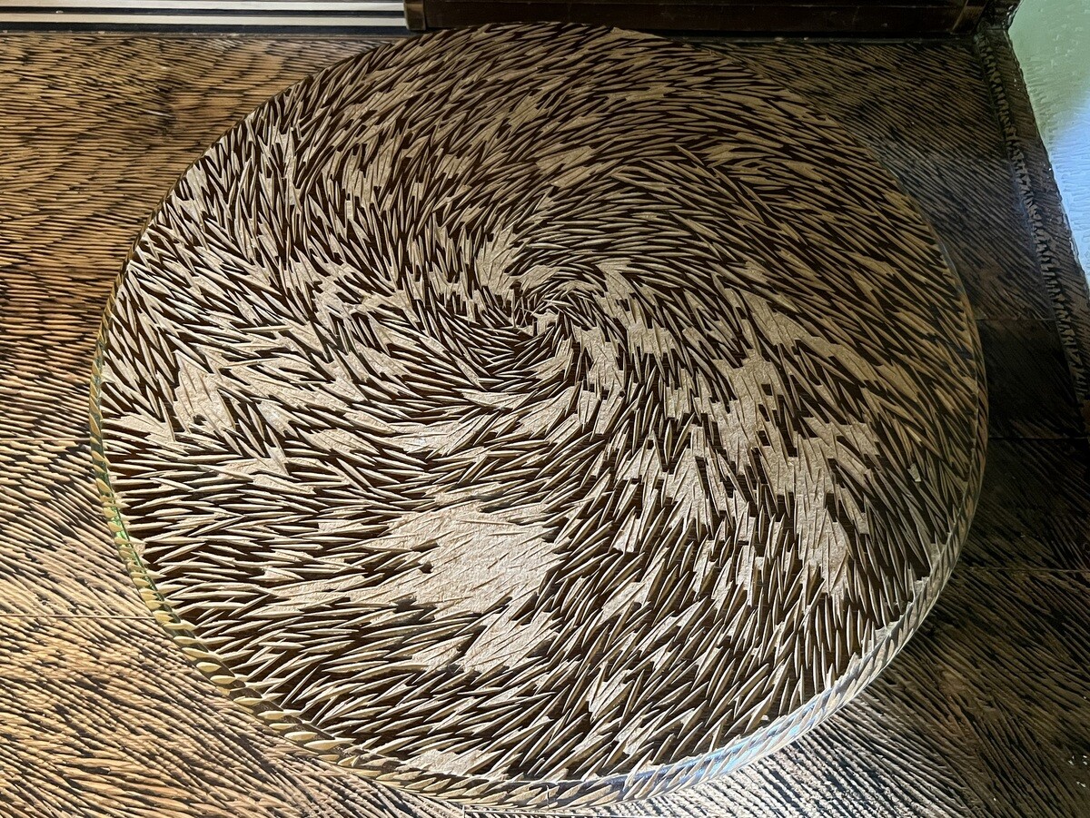 一階の床と、テーブルのみ円を描いた彫刻となっているが、他は全て右斜めへと彫られている。