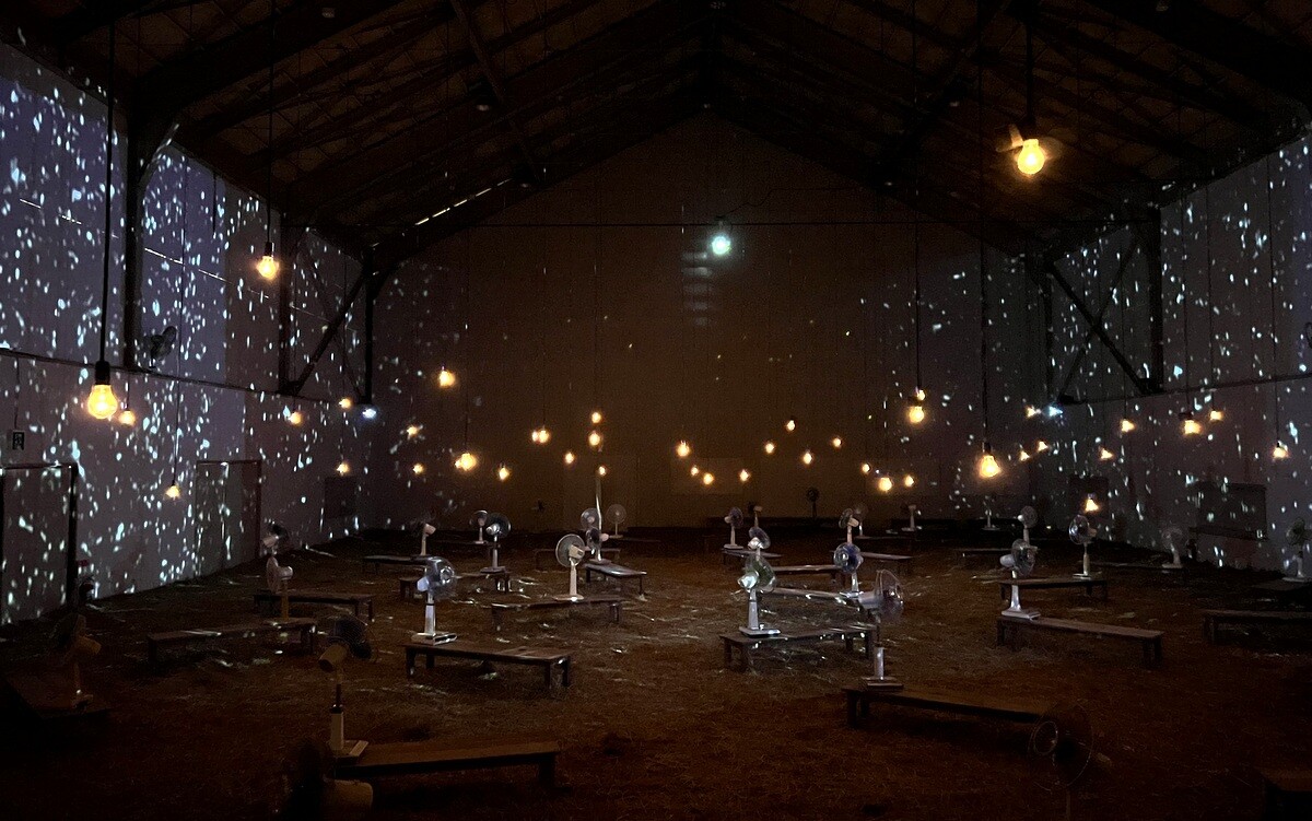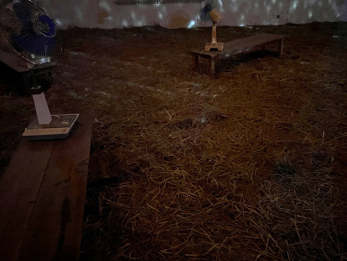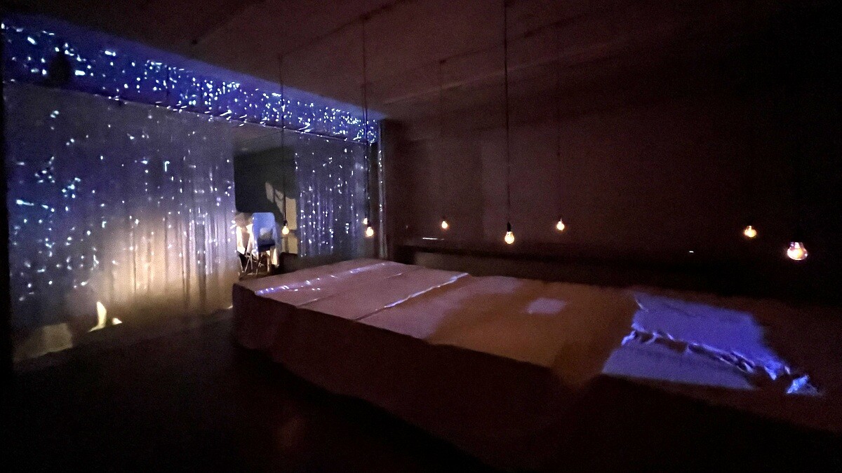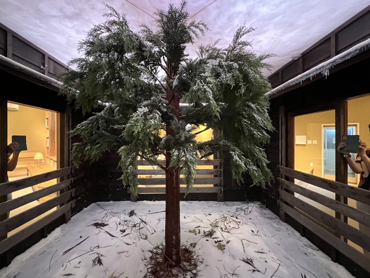 足元には干し草が敷かれてふかふか。その香りを感じながら鑑賞するのだが、両側のスクリーンには、豪雪地帯の降雪をイメージ。