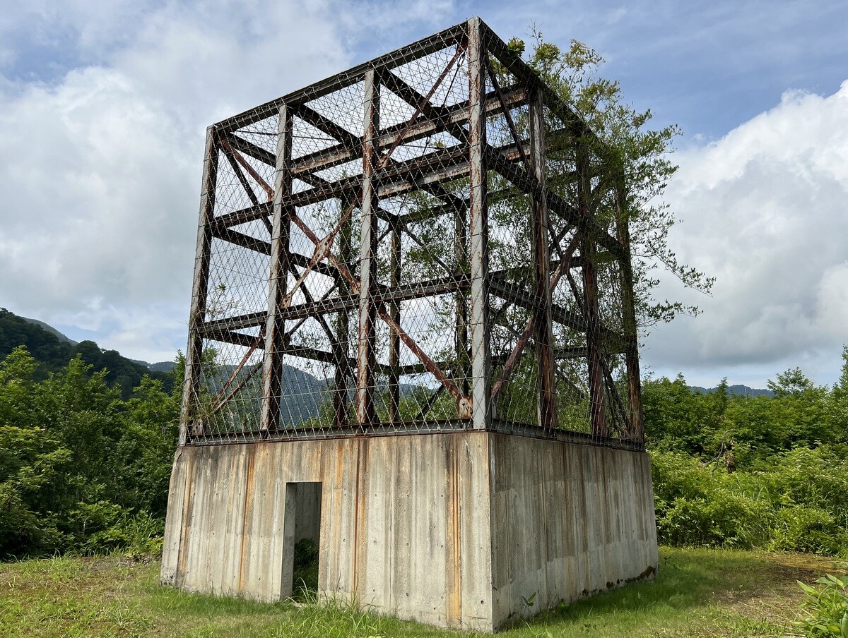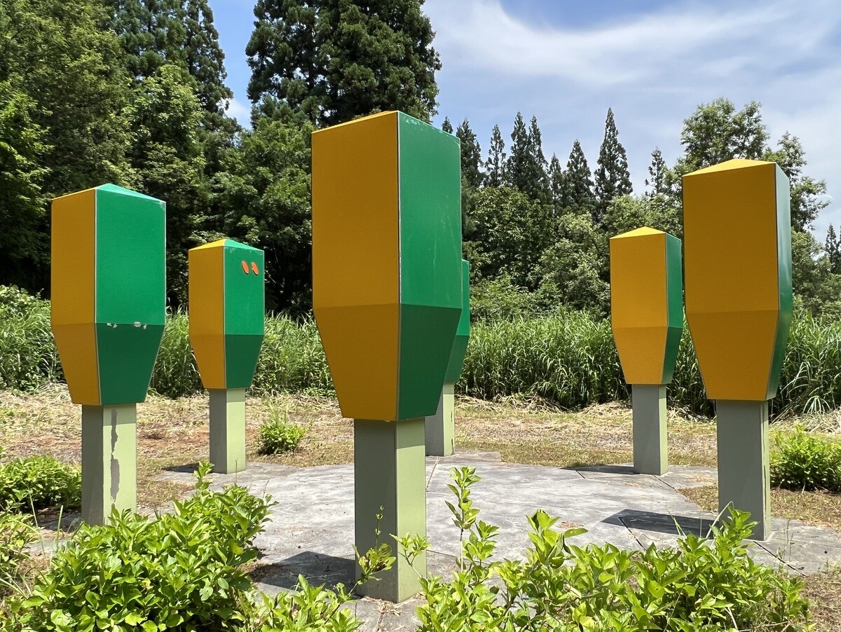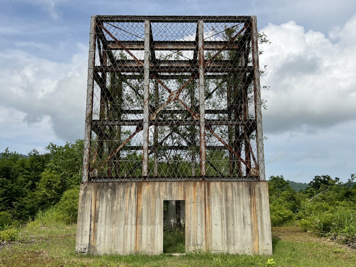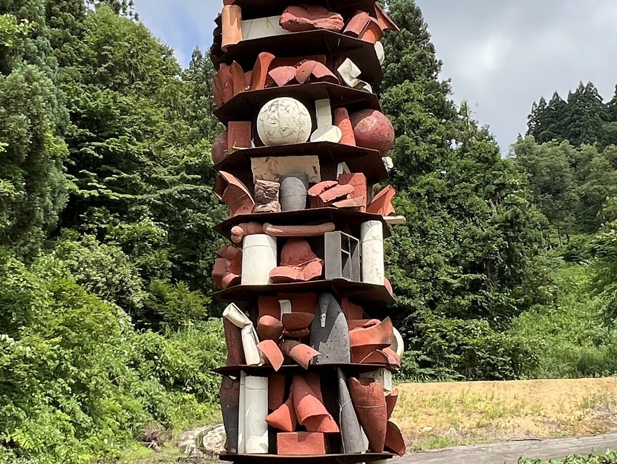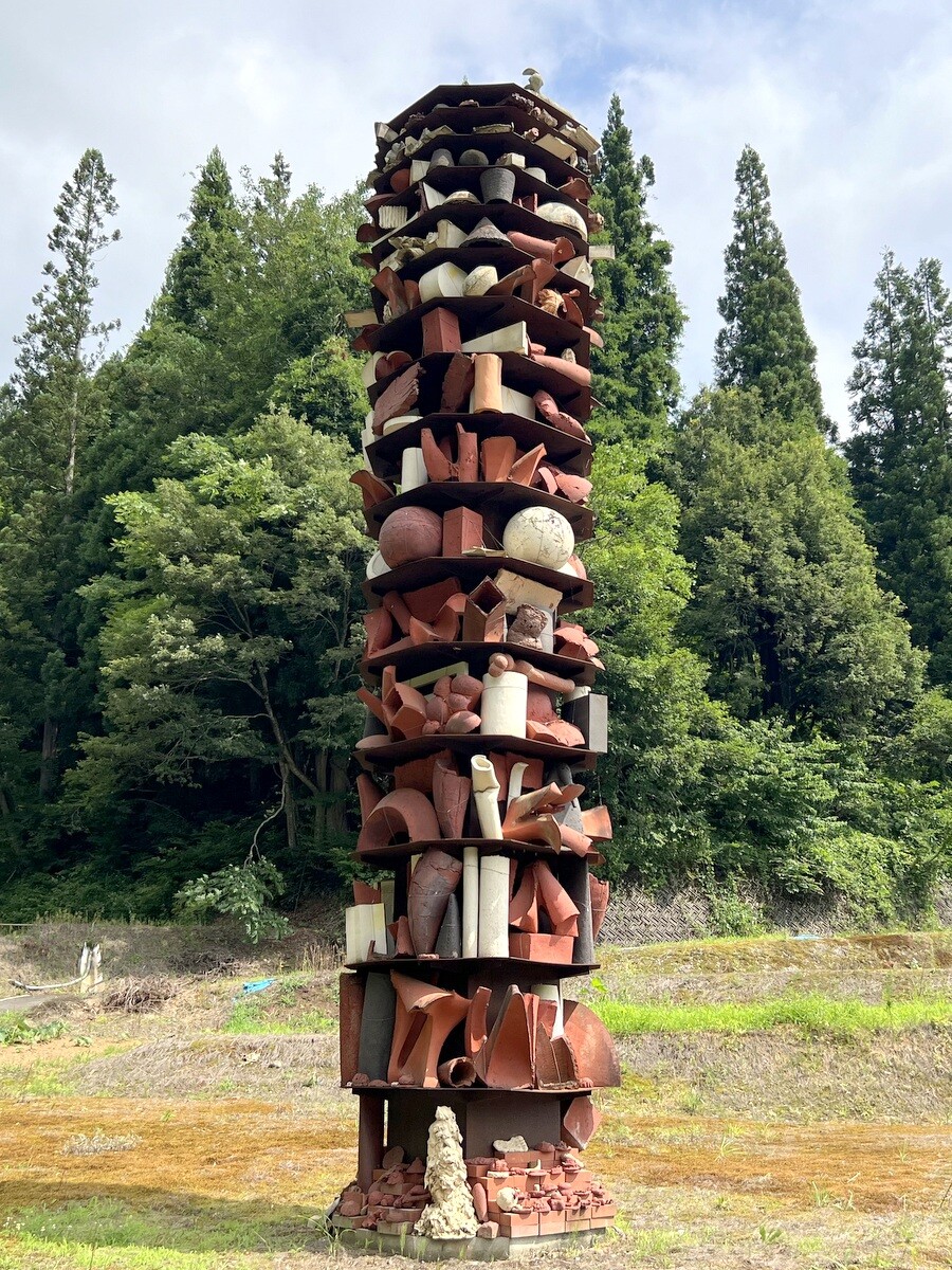 Y068 山本健司「掃天帯地 ー天水越の塔ー」 高さ8メートル、幅1.6メートルの鉄塔の中に、地元の土を混ぜた陶作品が入っている。