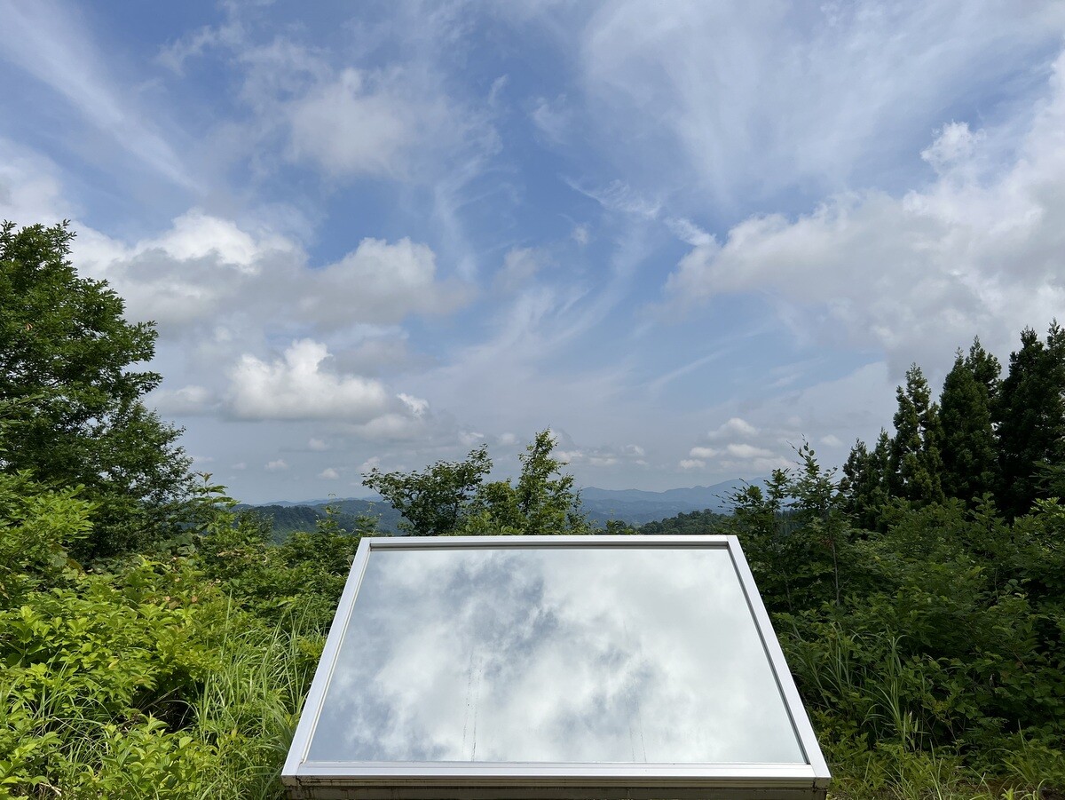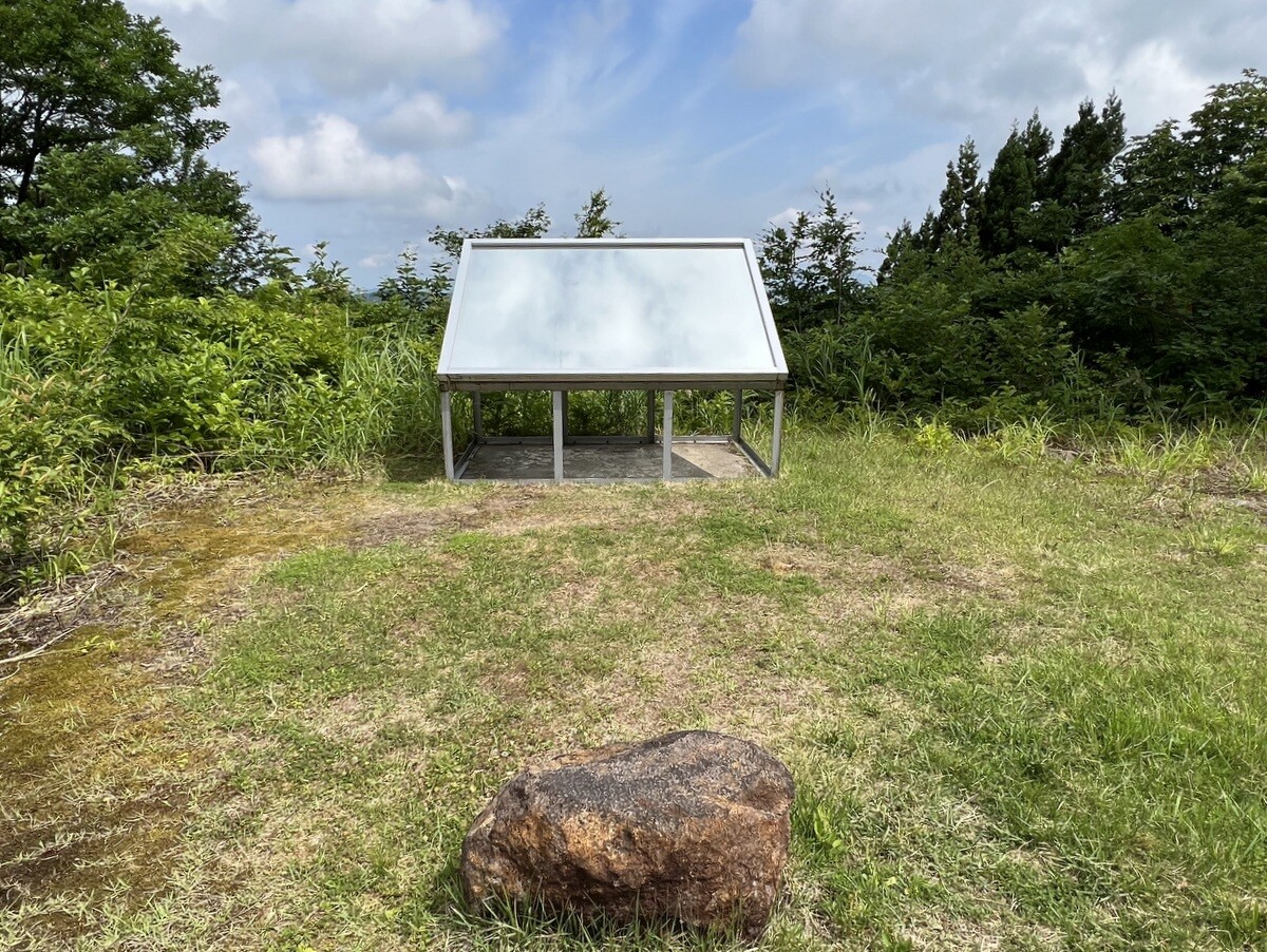 Y065 堀川紀夫「Sky Catcher 09」空を映す鏡と、出土した石のベンチが置かれている。