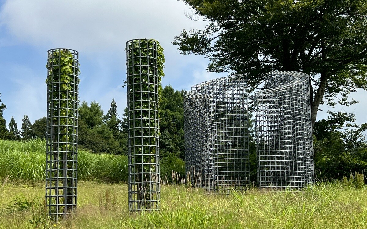 Y003 眞板雅文「悠久のいとなみ ーThe Eternal」 奥に続く1本のブナの木を見る為に、格子状に溶接した鉄筋の門柱のようなオブジェがある。