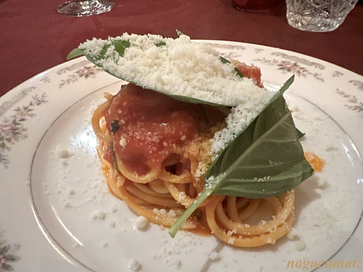生パスタのタリオリーニに完熟トマトのポモドーロ 1700円。これも半量。メニューにはこの組み合わせはなかったのだが、作って下さった。パスタのコシが非常にあって美味しい。少し酸味のあるトマトソース。