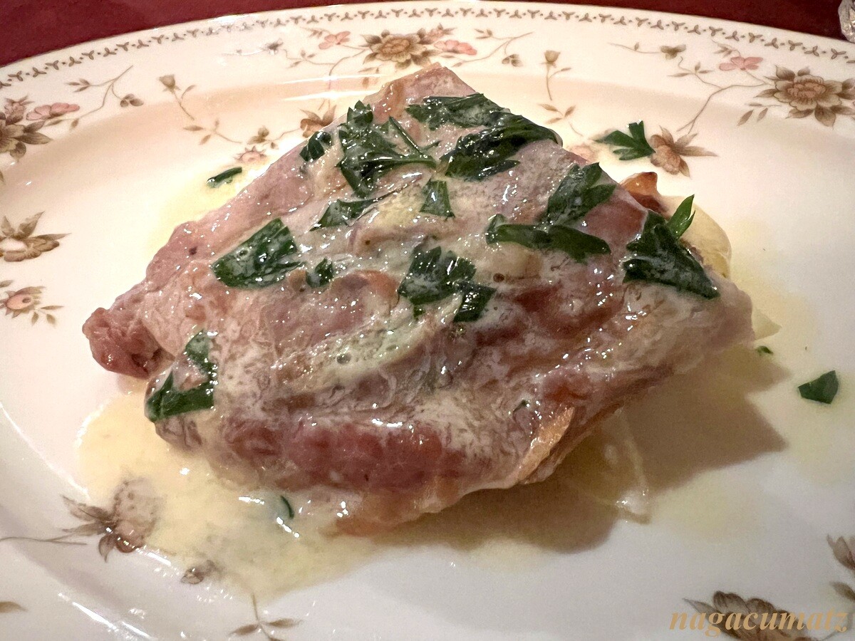 山形豚のサルティンボッカ 2850円 これも半量。下にはジャガイモのクリームグラタンが敷いてある。生ハムが巻いてあり、イタリアンパセリにレモンの香りも。