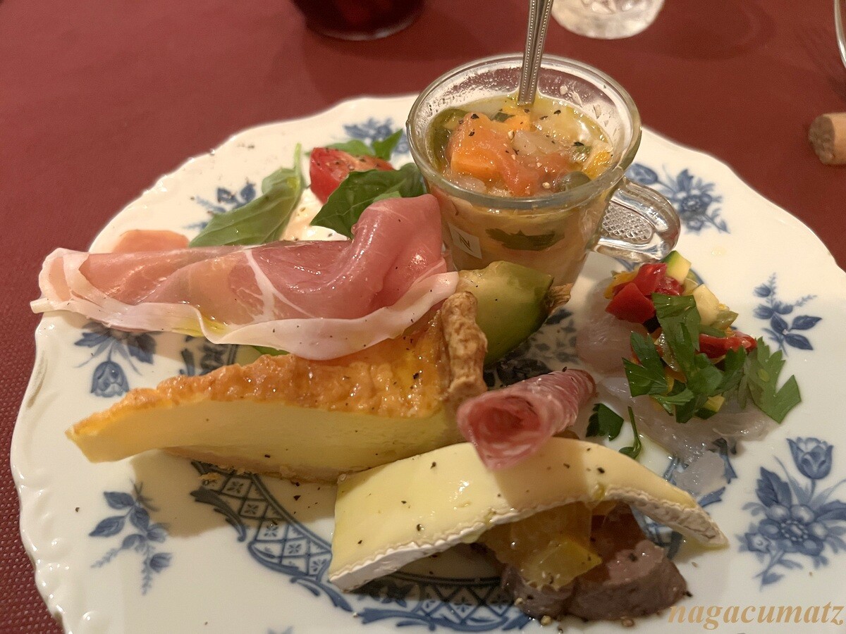 シェフの地元産の野菜で作った温かいミネストローネ、真鯛のカルパッチョ、牛レバーの冷製にオレンジソース、白カビのチーズ、サラミ、キッシュ、生ハムにメロン、ブッラータのカプレーゼ。もうモリモリ。