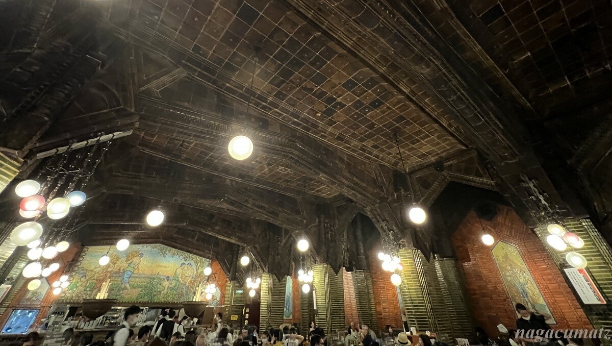 創業当時からの建物を堪能できるのは嬉しいのだが、〇テーブルに置かれているアクリル板は申し訳程度の大きさで、テーブルや通路の間隔もとても狭いまま。天井が高いので声が響く為、そしてお酒も入っているので、皆が大声で話していて、ちょっと我々としては恐かったので、早々に退散💦