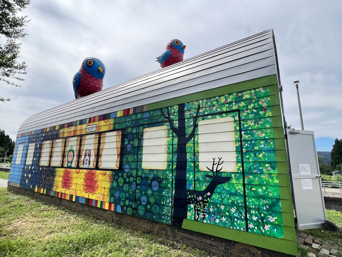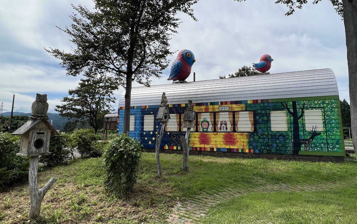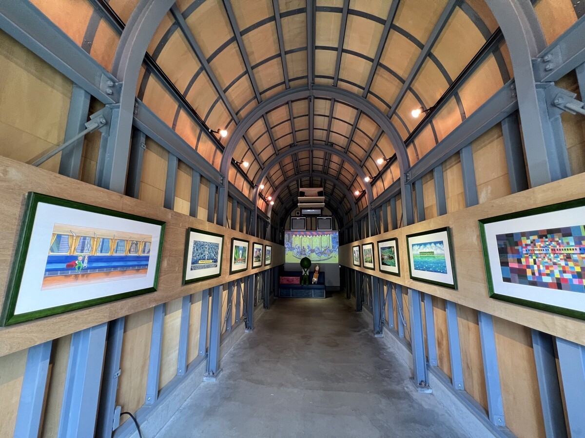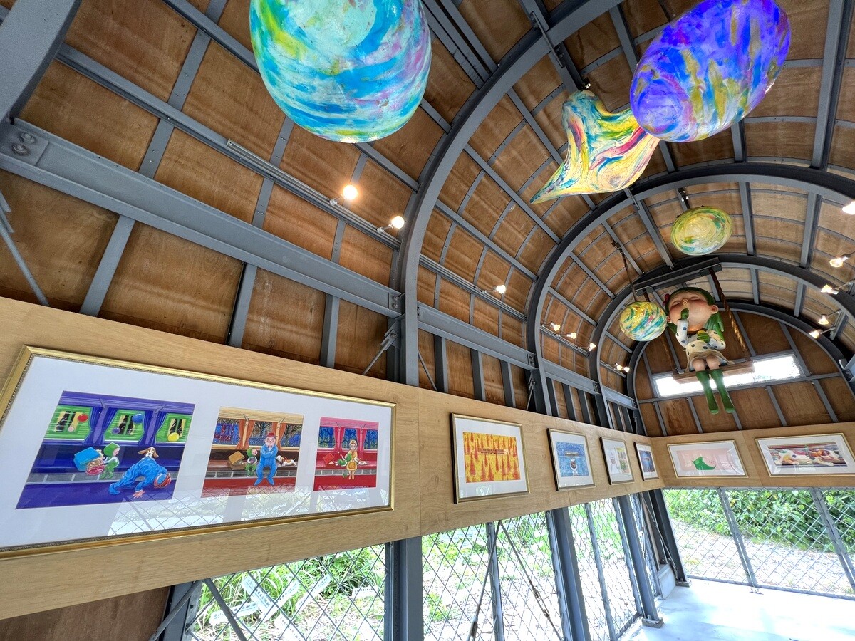 T325 ジミー・リャオ 幾米(台湾)「Kiss & Goodbye (土市駅)」 妻有特有のカラフルなかまぼこ型倉庫を使用。