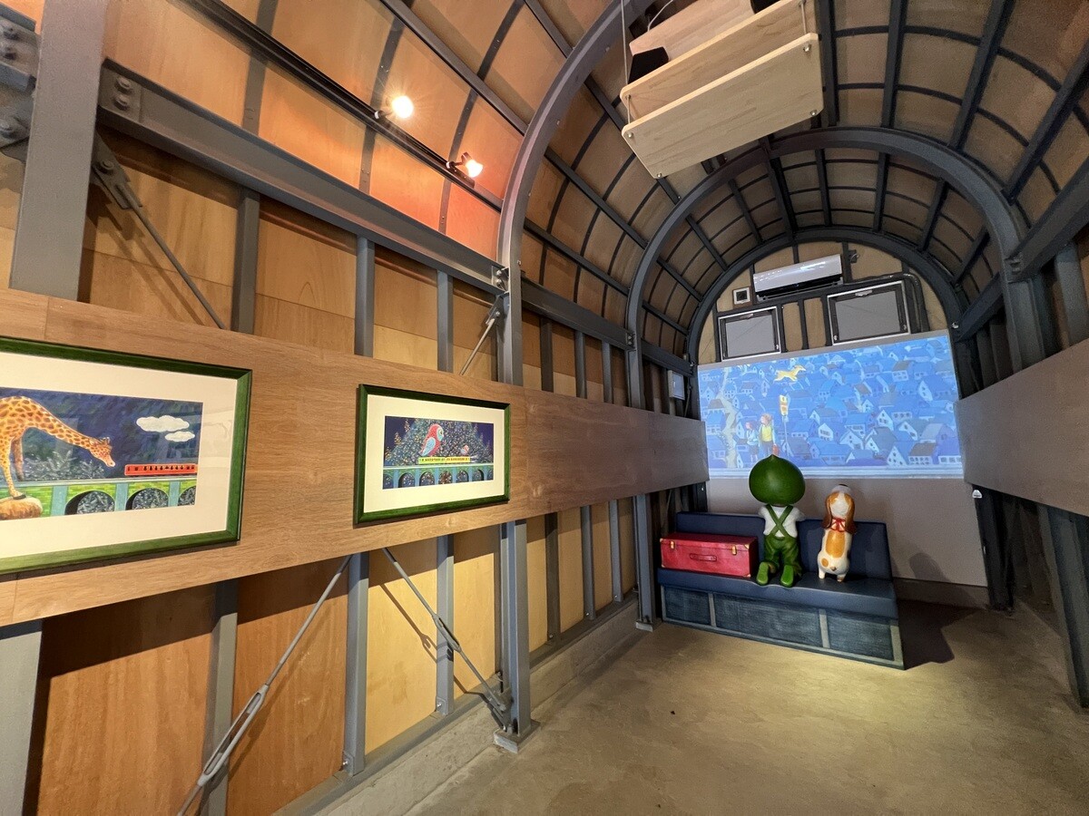 奥には映像が流れていて、車窓からの様子などが流れ、それを座席から見ているようなイメージとなっていて可愛い。