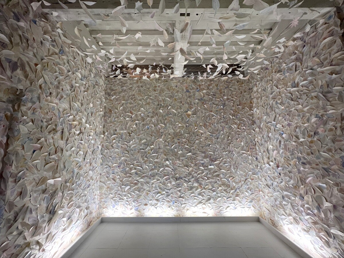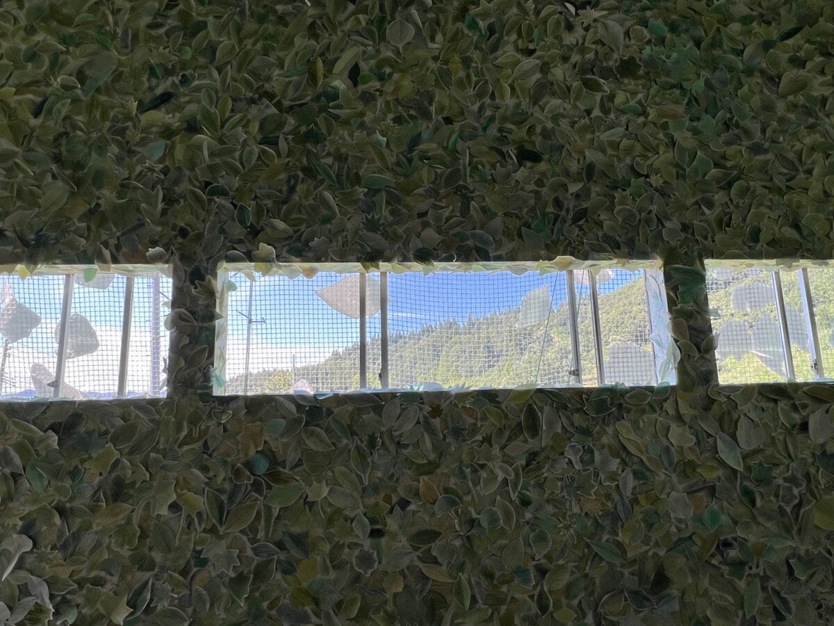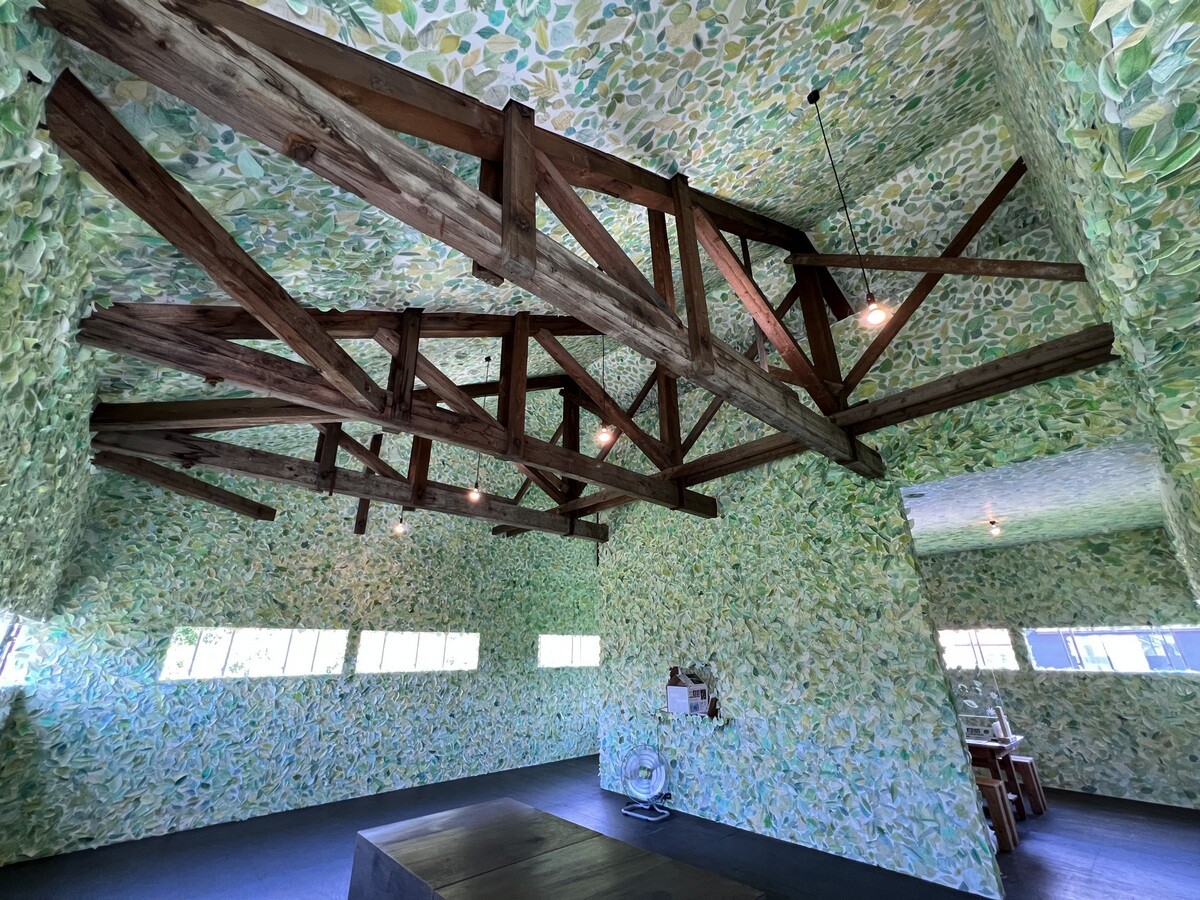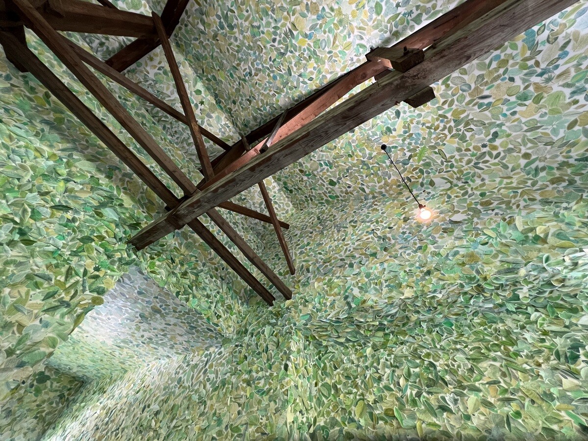 壁も天井も緑の葉で覆われている。この葉は、本物の葉を象って、それに鑑賞者が決まったペンで着色し貼って参加できるようにもなっている。