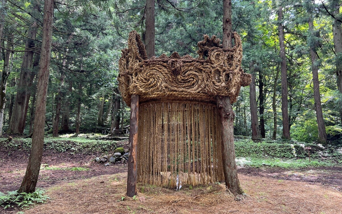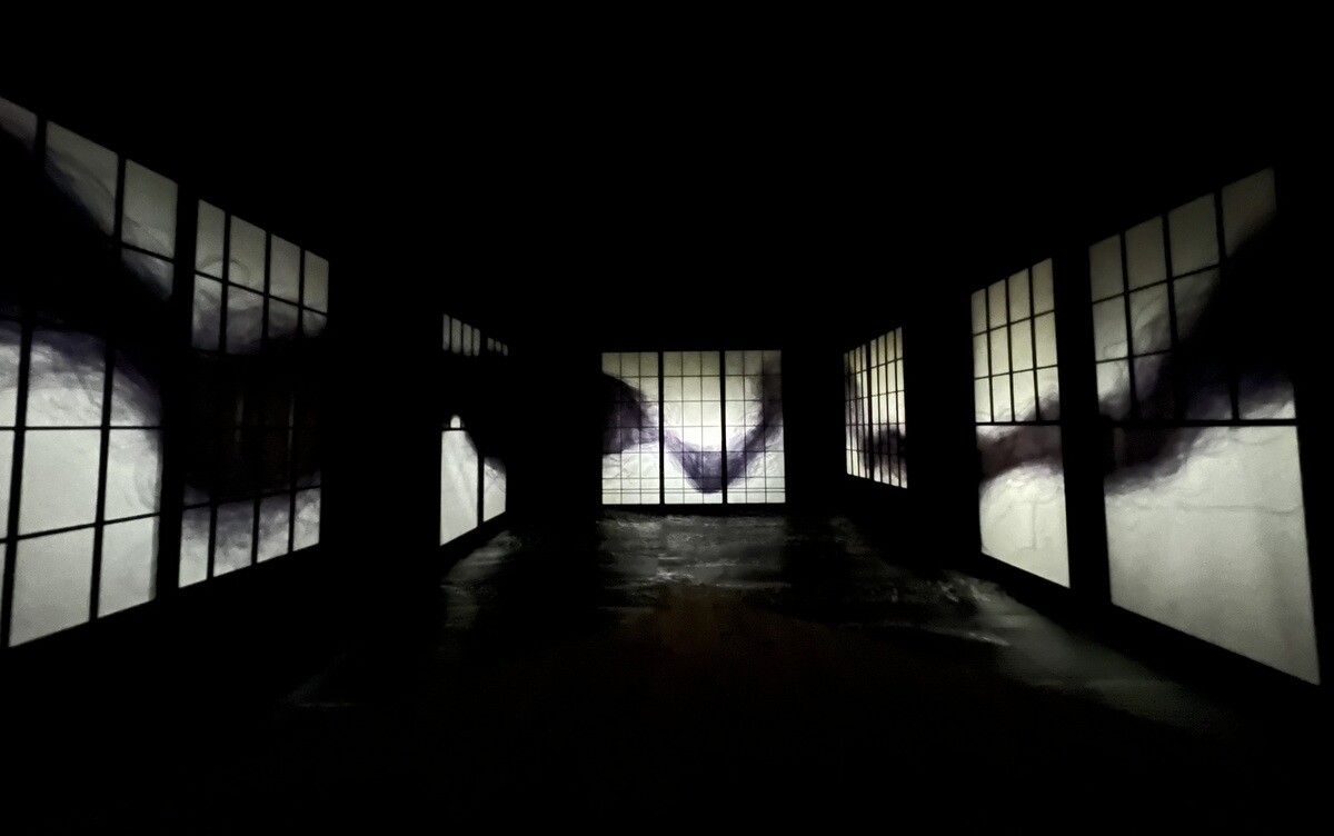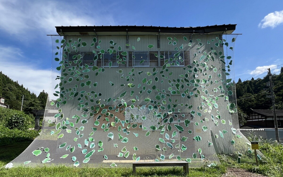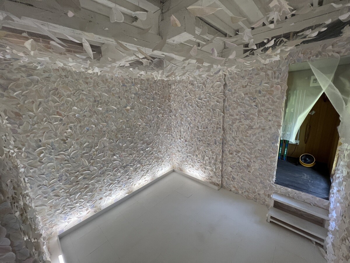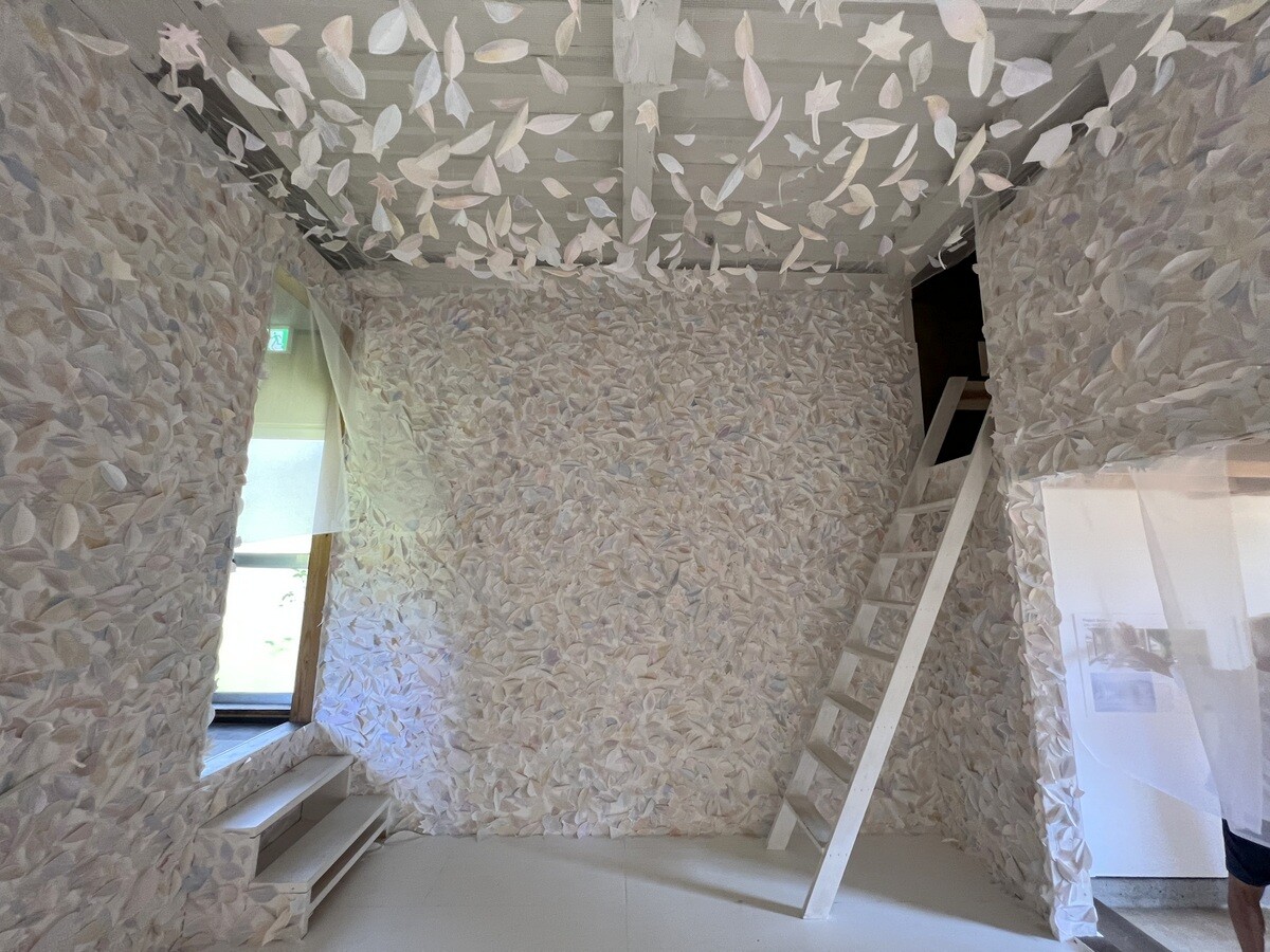 壁も天井も緑の葉で覆われている。この葉は、本物の葉を象って、それに鑑賞者が決まったペンで着色し貼って参加できるようにもなっている。