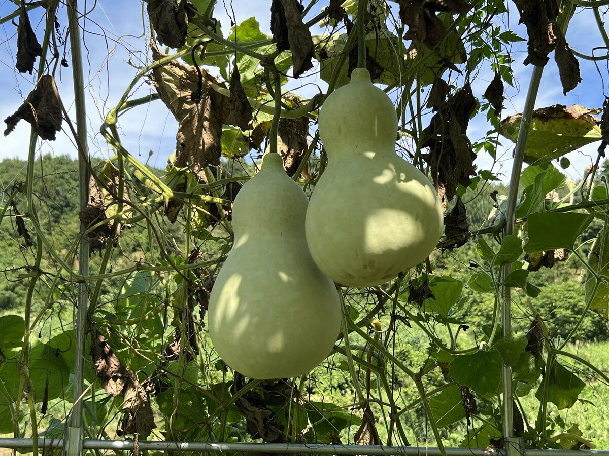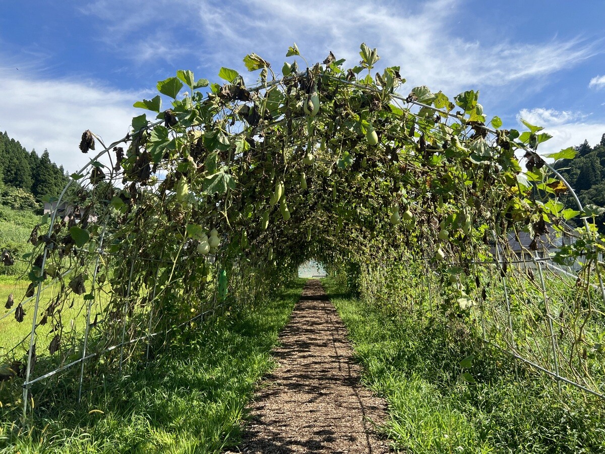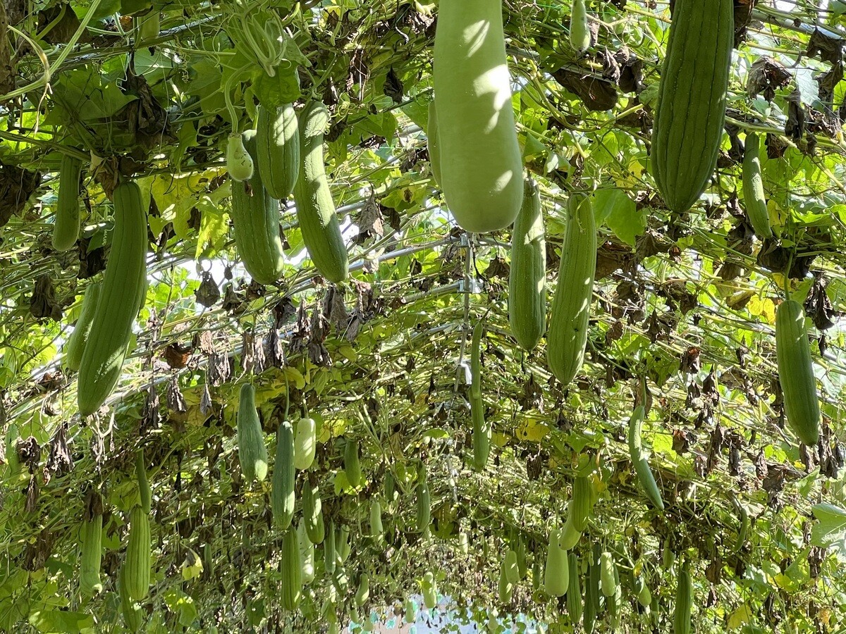 T392 酒百宏一「みどりの部屋プロジェクト 2021-2022」 まずは緑のトンネルを抜けていくのだが、そこには、ゴーヤ、ひょうたん、ヘチマ、ウリ、スイカなどがなっている。