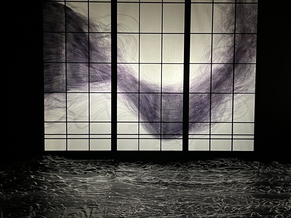 T424 椛田ちひろ「ゆく水の家」 ボールペンだけによる描線は圧巻。一階は「流れ」を表現。光の当たり具合で、そのボールペンの部分の色も黒から紫っぽく変わるなど面白い。