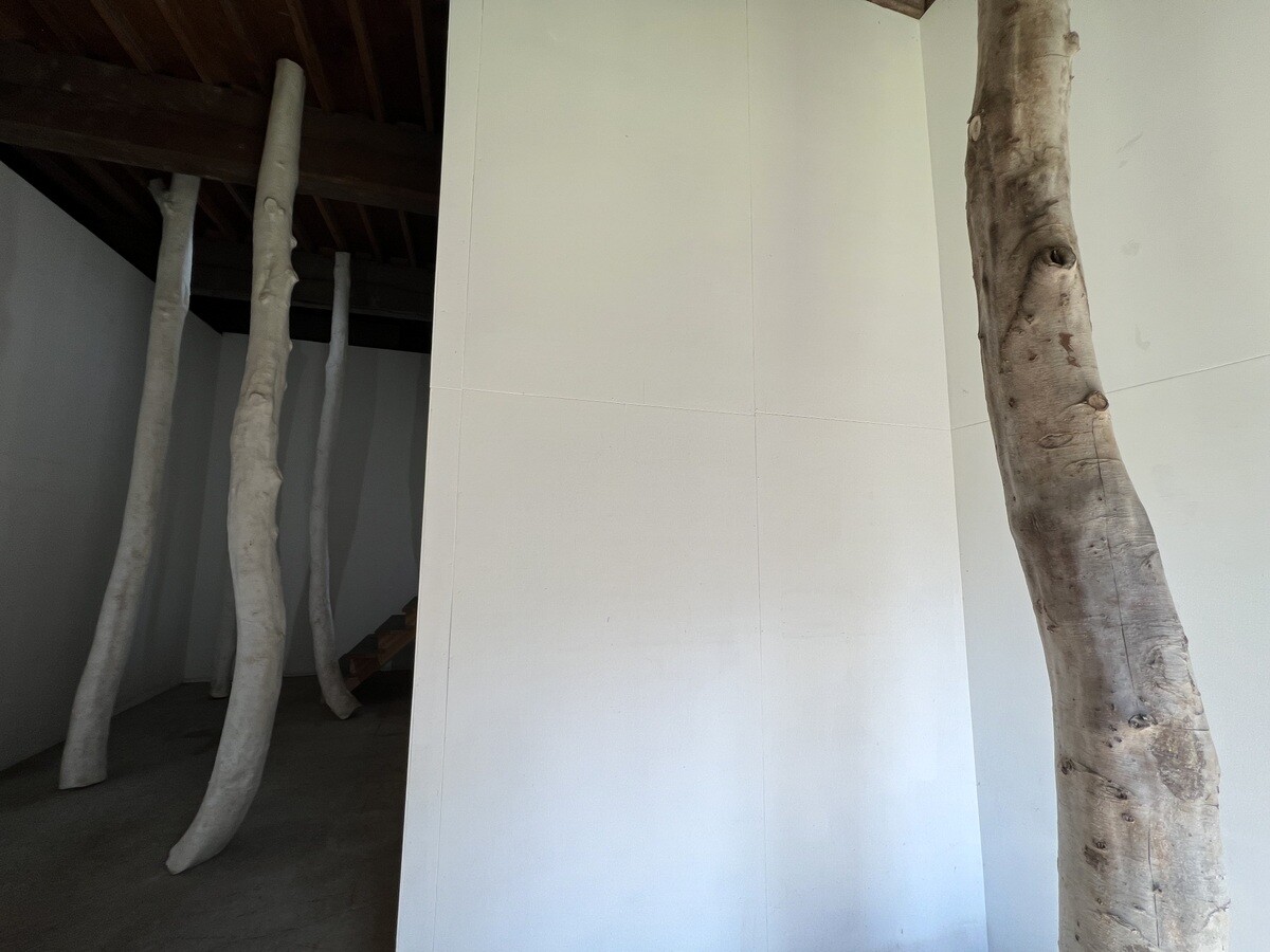 右側にあるものは本物のぶなの幹で、それを型にして紙を貼って硬めた後に剥がして、白い紙で出来たぶなの幹を作り、さもその紙の幹が2階部分を支えているようなイメージを作っている。