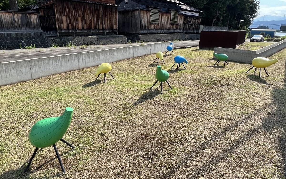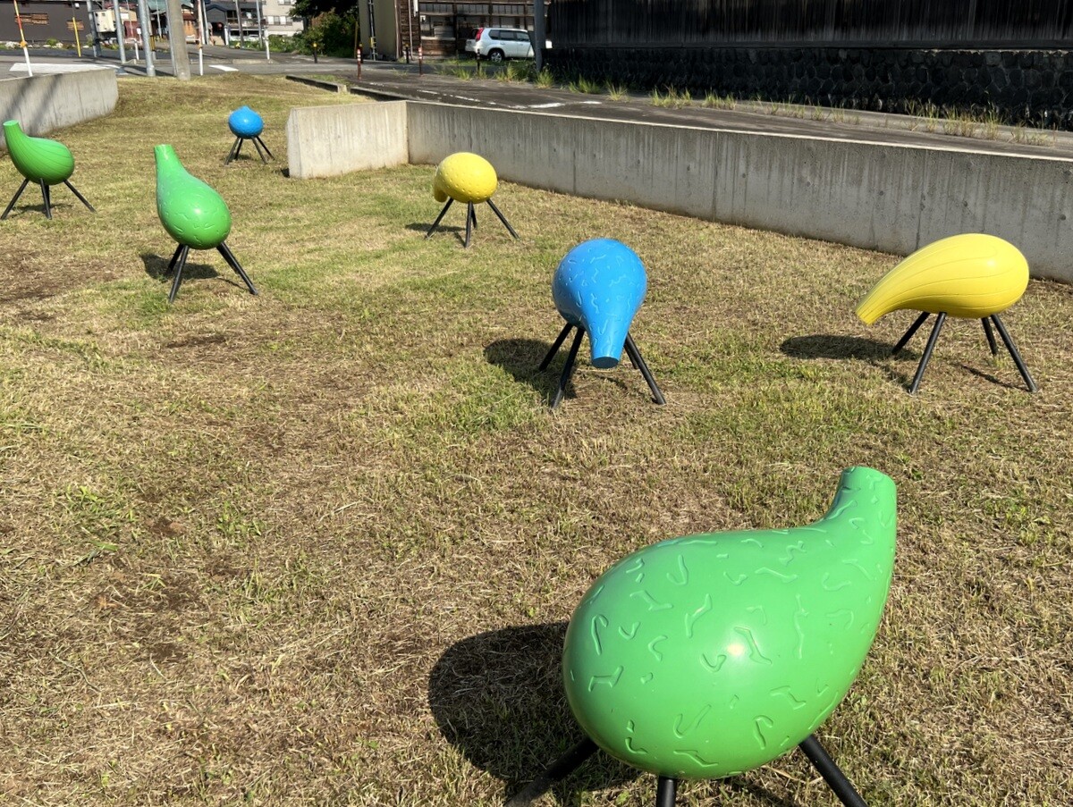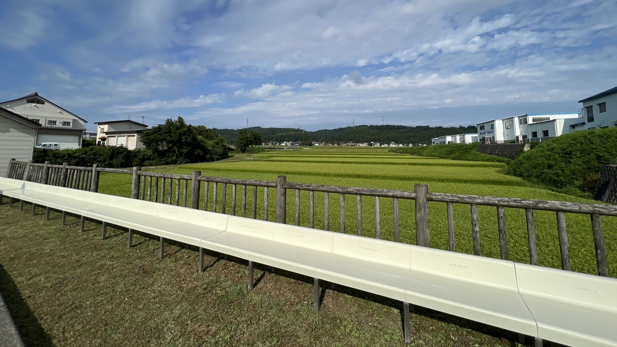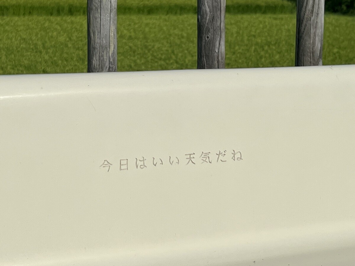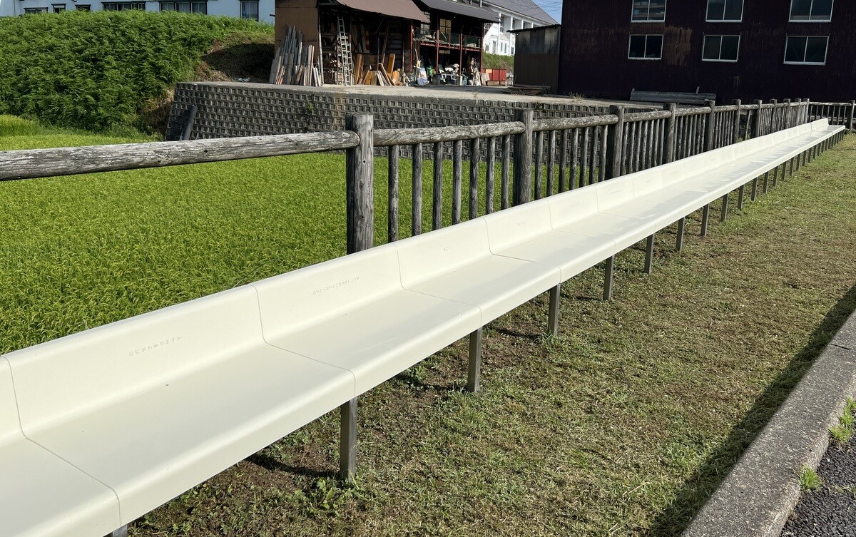 K034 足髙寛美「パッセージ」 バス停に設置された72人が座れるベンチ。それぞれの背もたれに、足髙氏と地元の高校生が共に考えた言葉が刻まれている。