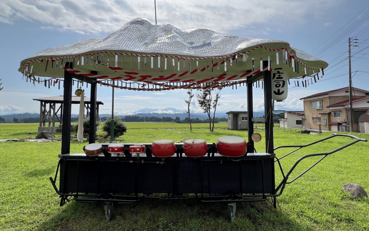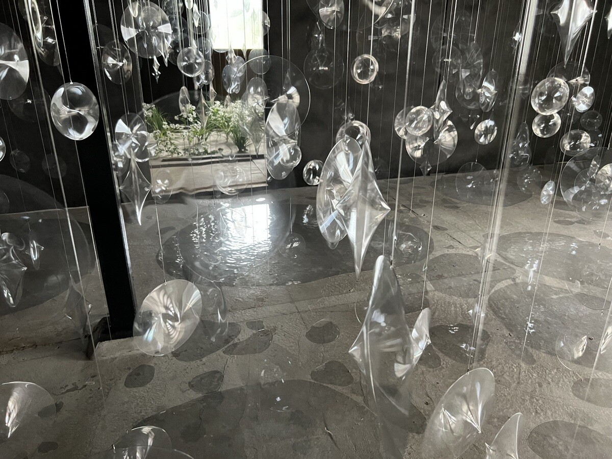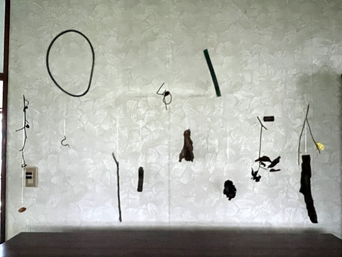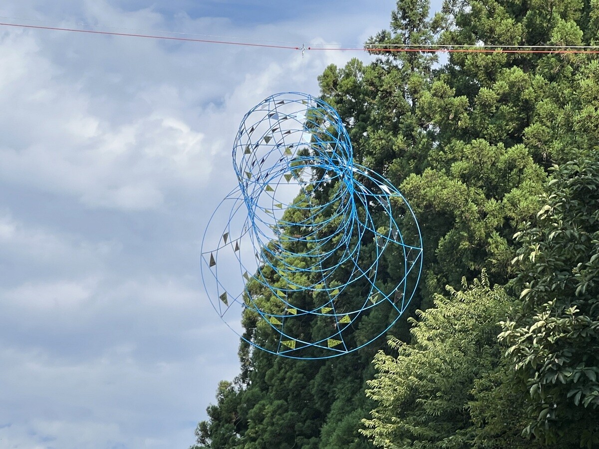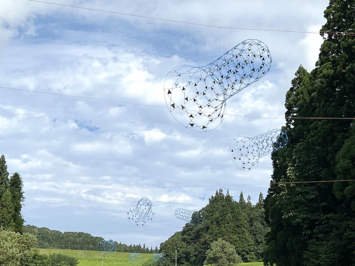 K109 岩城和哉 + 東京電機大学岩城研究室「大地を縫う」 水平に張られたワイヤーに吊られたオブジェが風で動く。