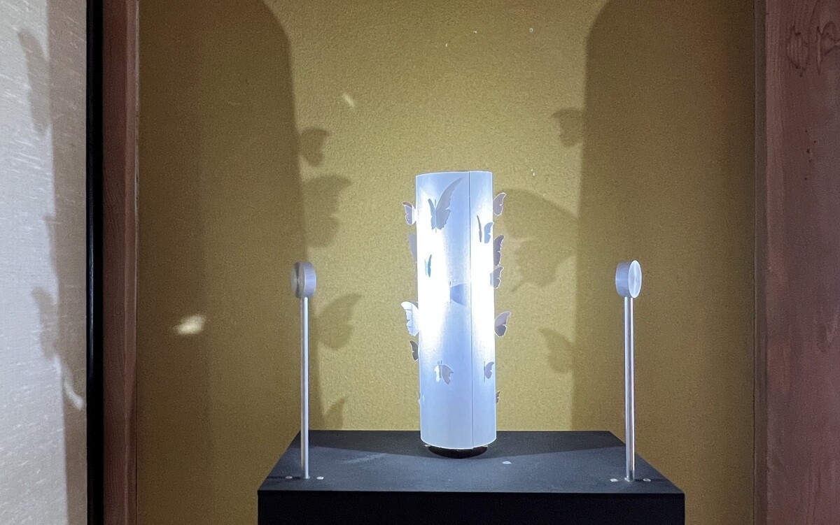 片側だけの蝶々が付いた円柱が回転していて、それをライトが照らし出している。