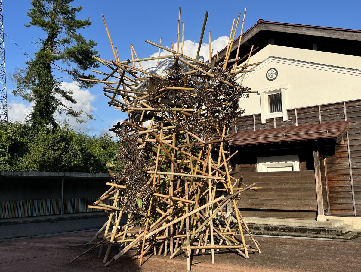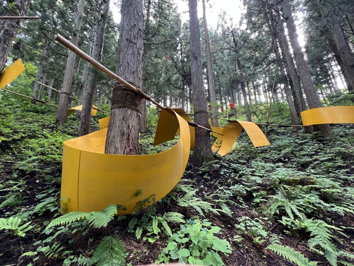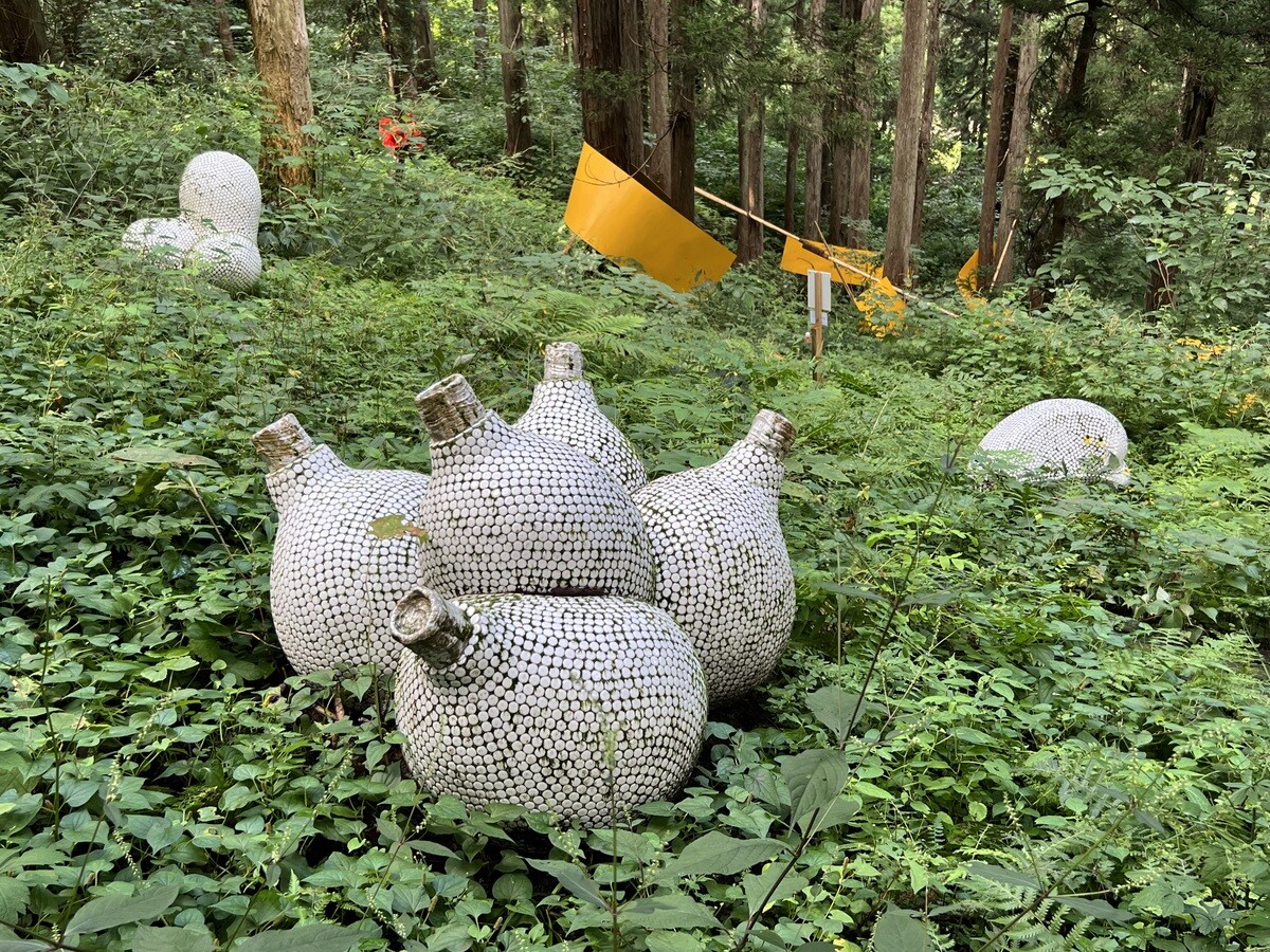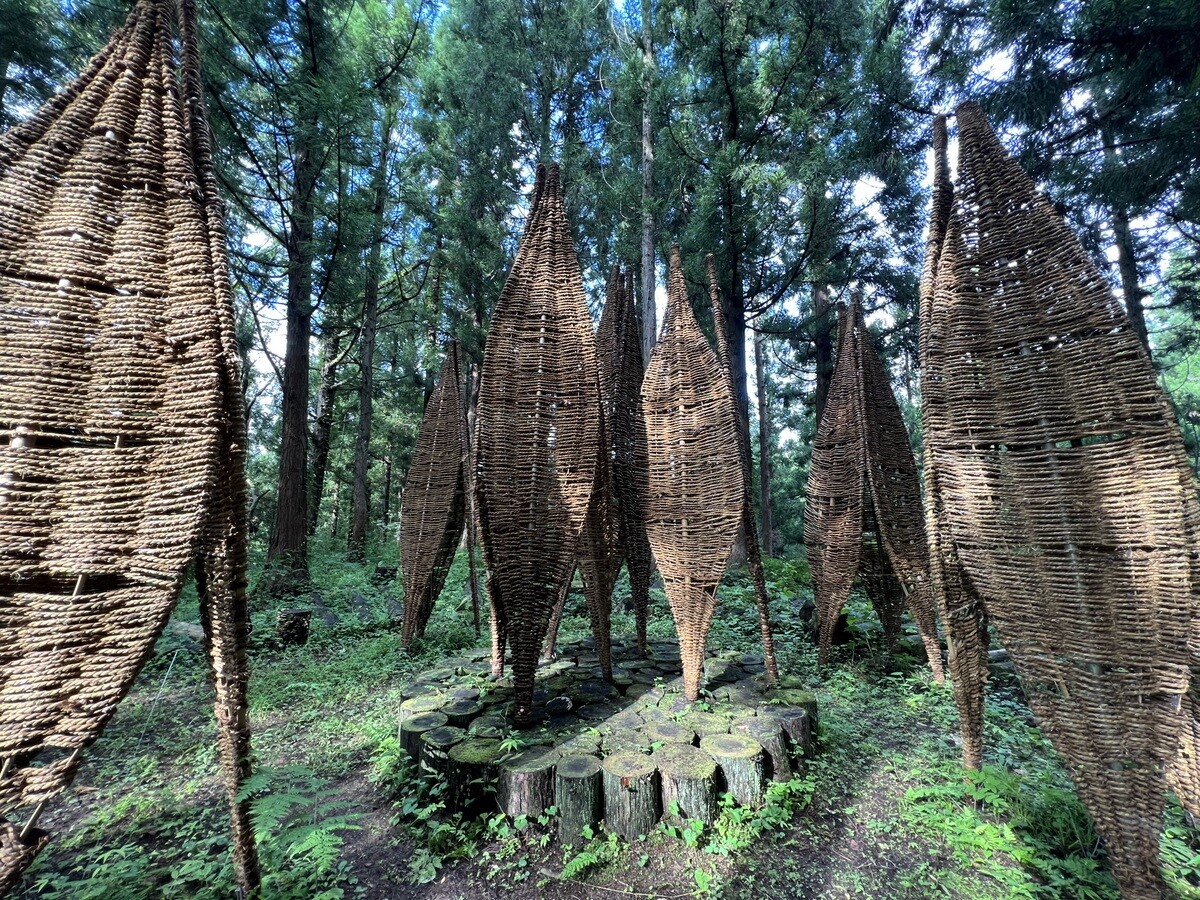 D368 大塚理司「王国」 竹を芯にして、藁縄を編み込んだ葉の形のオブジェが道標となっている。