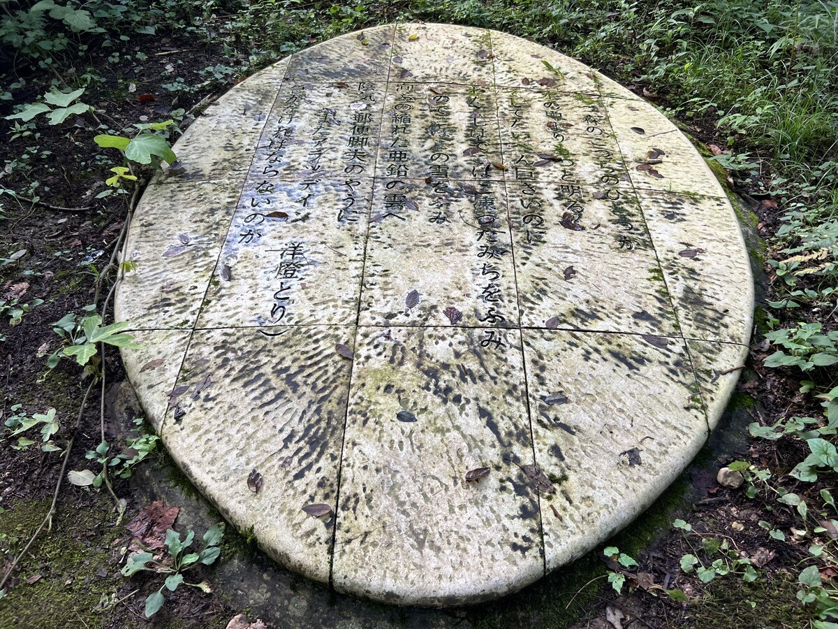 D008 依田久仁夫「希望という種子(シュジ)」 宮沢賢治の言葉が刻まれた陶板。日本語のみならず、外国語でも書かれているようだが、経年で読みづらい💦