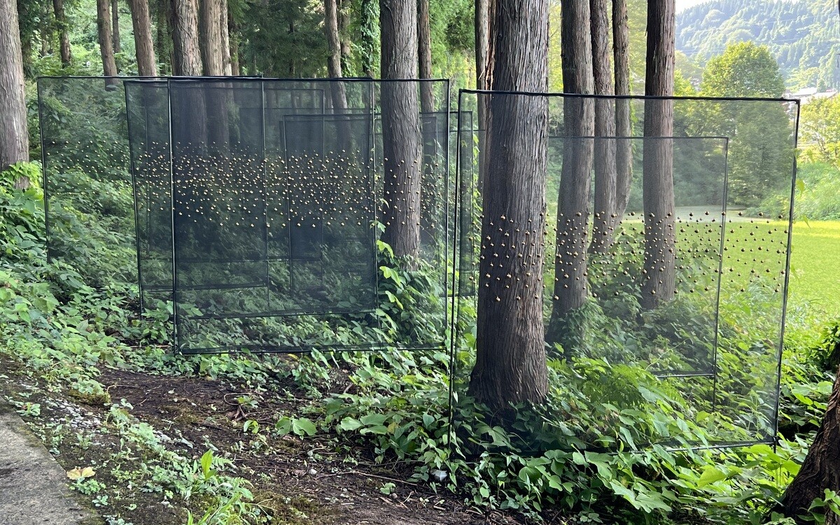 D014 橋本真之「雪国の杉の下で」 雪の重みでたわんだ木々の姿を銅の彫刻で表現している。