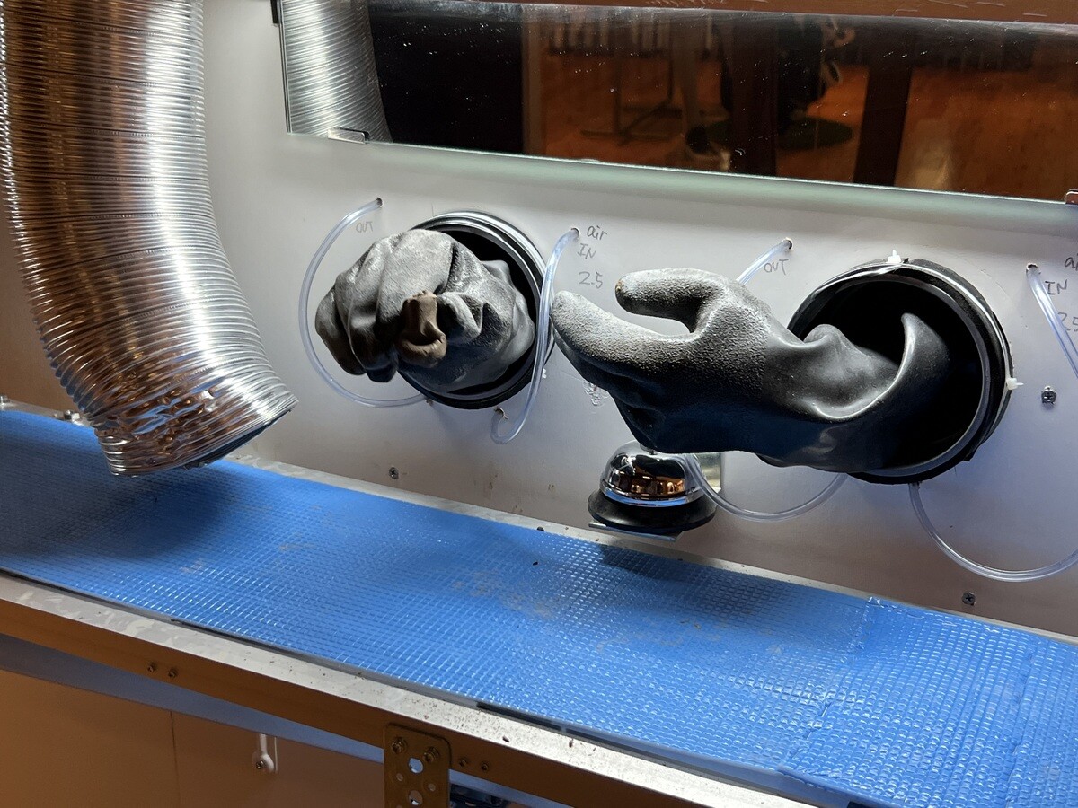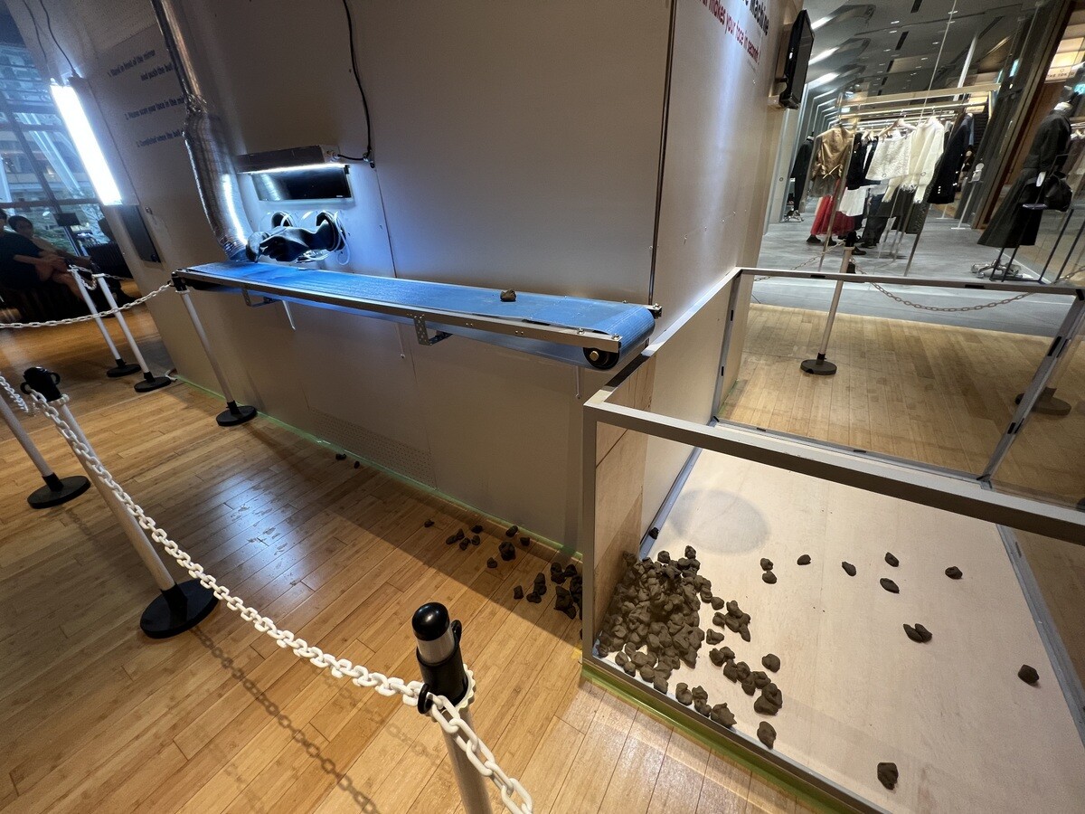 古屋崇久「人工知能による顔の識別」 即興で粘土を使って鑑賞者の首像を作ってくれる。そしてそれはベルトコンベアに乗って箱にポトリ。