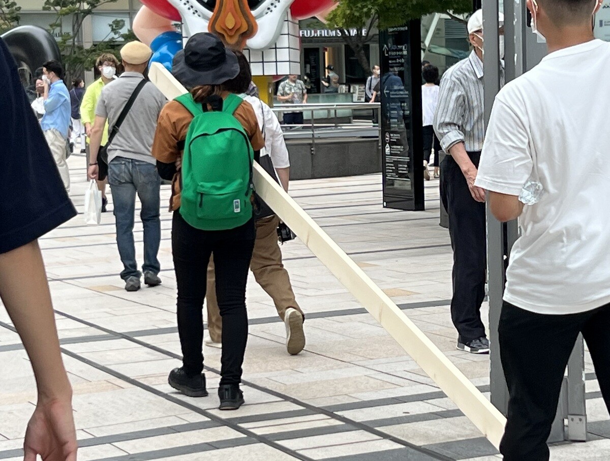 山本千愛「犬も歩けば棒に当たる」12フィート(約3メートル65センチ)の木材を持って歩くプロジェクト。実際にご本人が歩かれている所にちょうど遭遇。私はラッキーな犬だったのかな😂