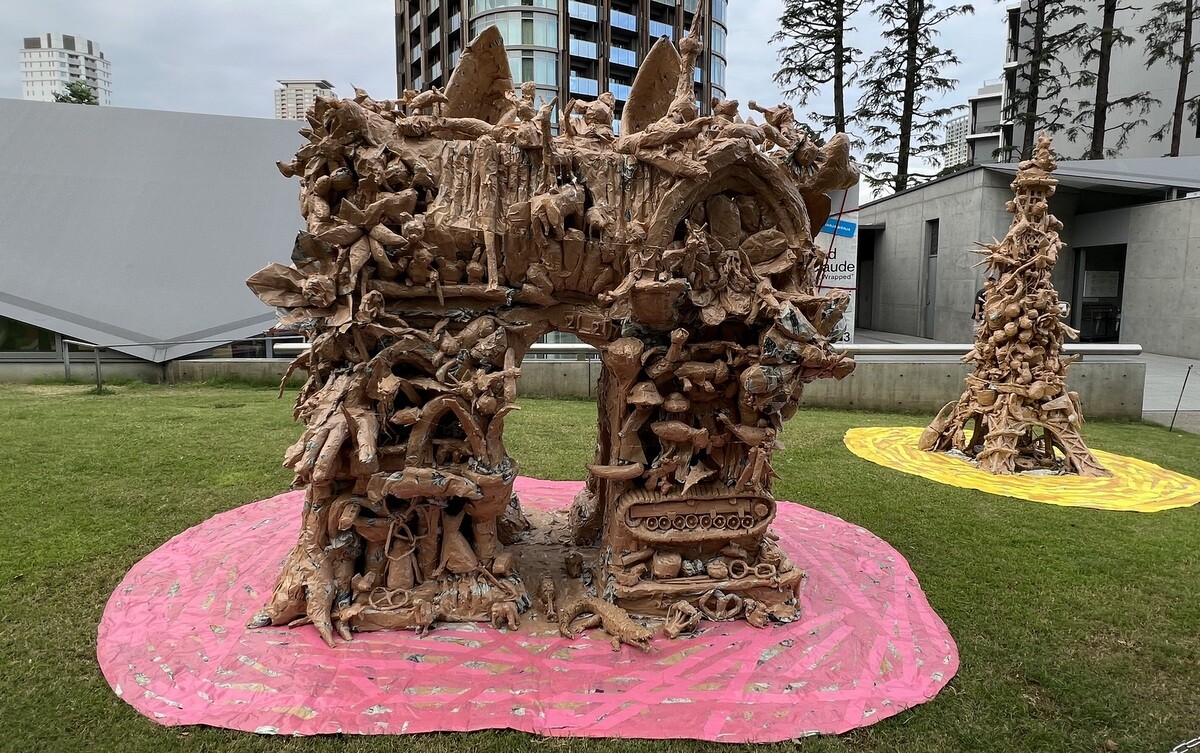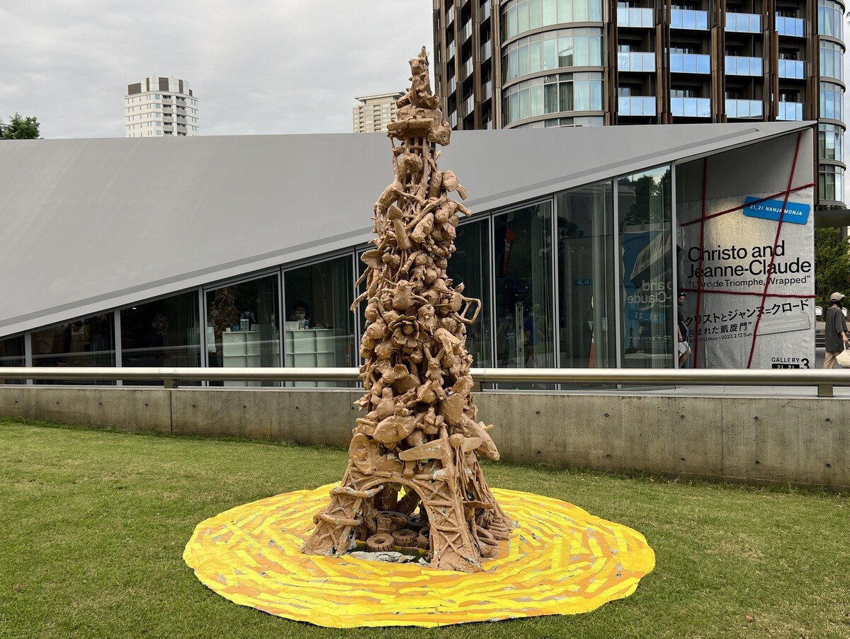 関口光太郎と六本木の人々「新聞紙とガムテープで包まれた凱旋門とエッフェル塔」 現在、21_21 DESIGN SIGHT 企画の「クリストとジャンヌ=クロード "包まれた凱旋門"」展の関連プログラム。