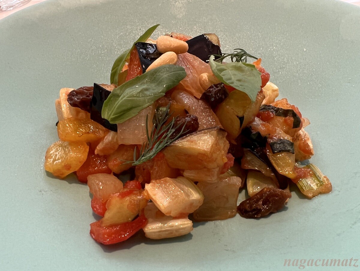 前菜は4種類ある中から、カラフル野菜のカポナータを。レーズンが良い感じ。
