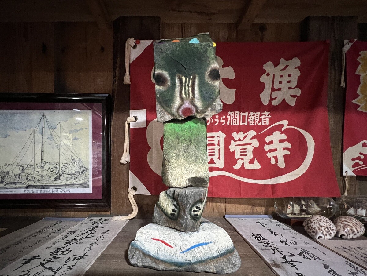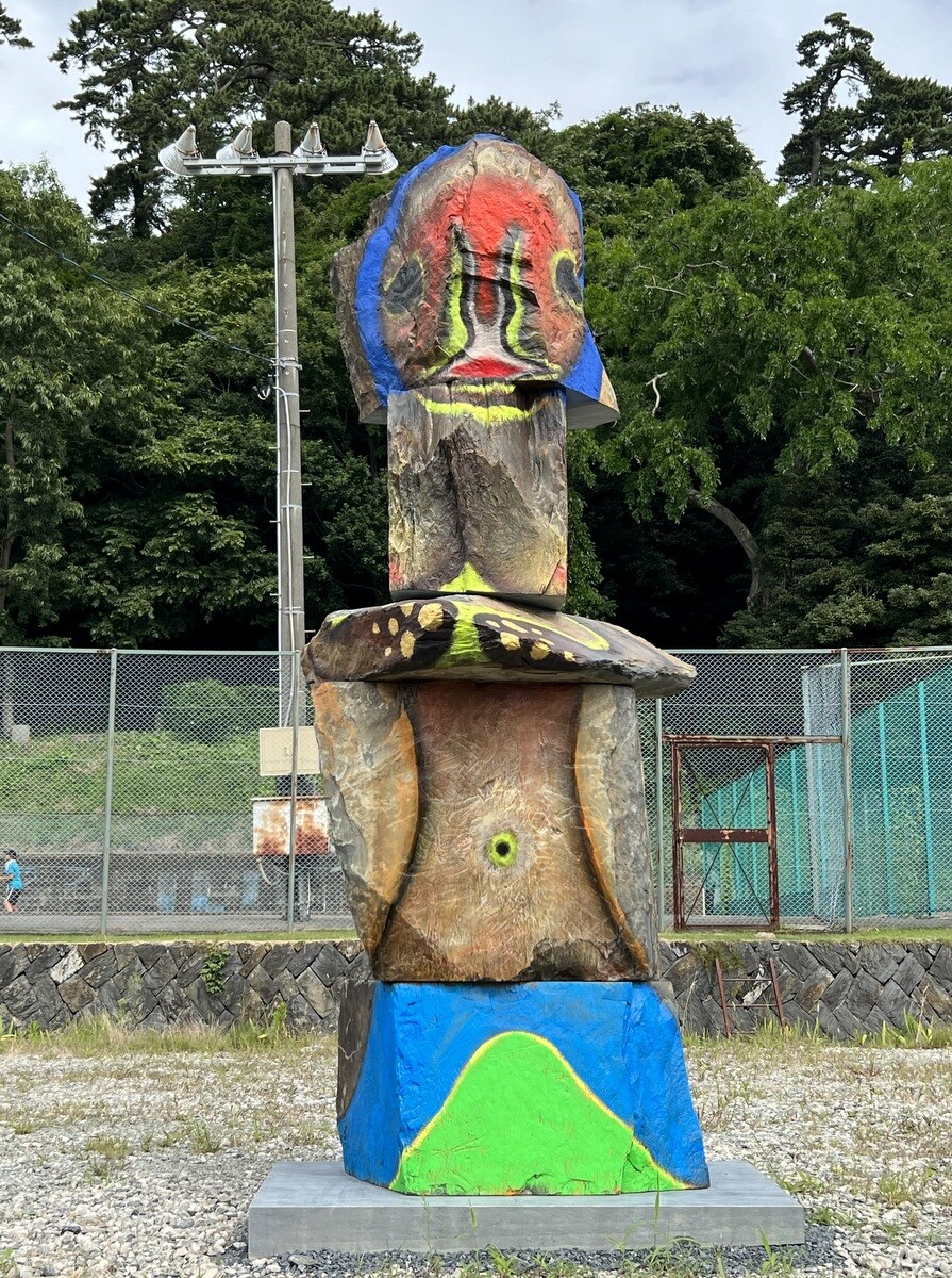 B2 加藤泉「無題」 石巻市稲井地区の採石場の石を使っている。積み上げた立像は3メートルになる。バックにある蔵の黒い窓の横に小さく見える文字の当たりまで津波が来たが流されなかった建物とのこと。
