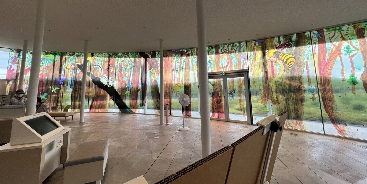 B7 弓指寛治「半透明な森」 石巻南浜津波復興祈念公園にある、みやぎ東日本大震災津波伝承館の窓硝子にある作品。この公園の植樹を体験したことにより、いつか苗が大木となり生い茂る森の姿をと。