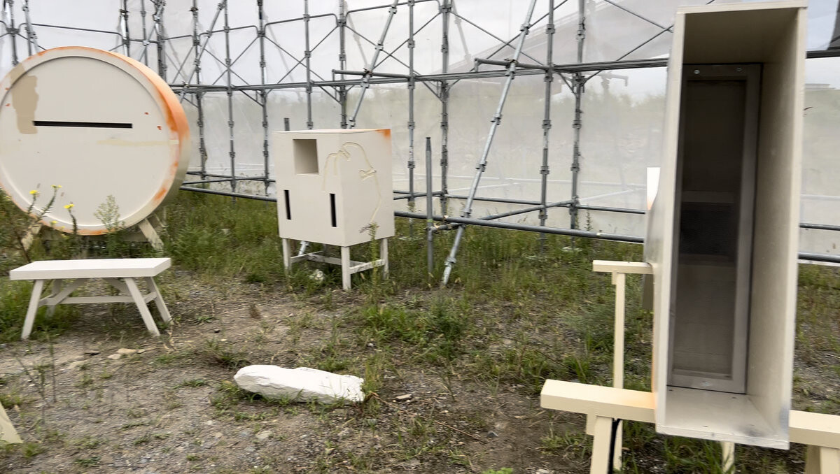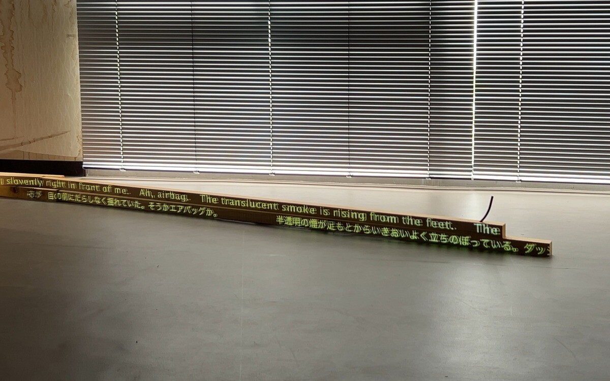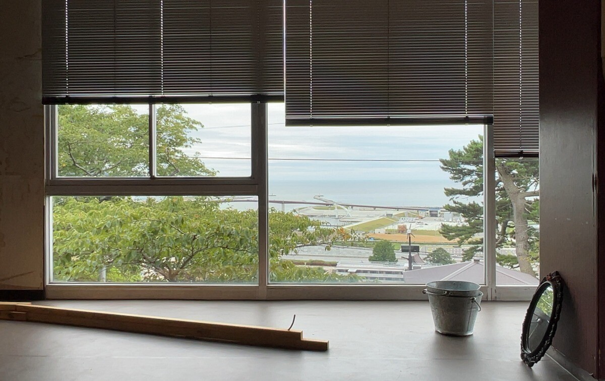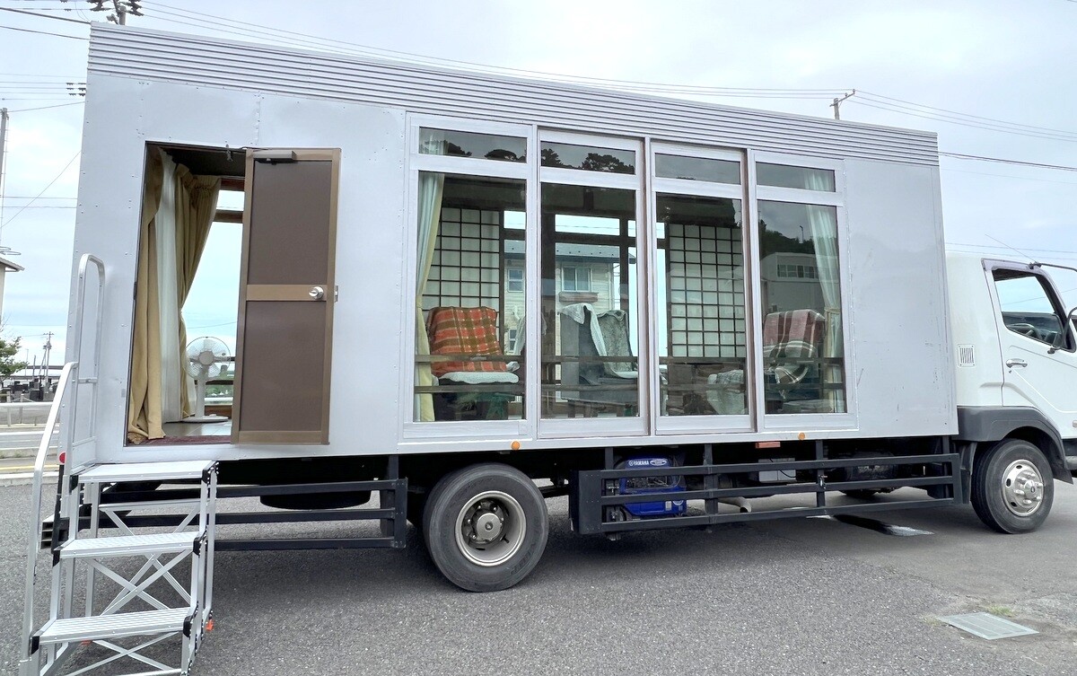 B4 目[mé]「repetition window 2022」 鑑賞者は、縁側にみたてたバスに乗り込み、動くバスの中から石巻南浜エリアの復興祈念公園周辺の変化した風景を眺めると言うもの。