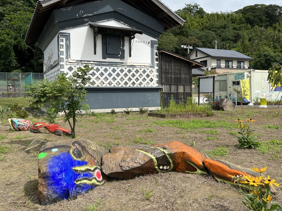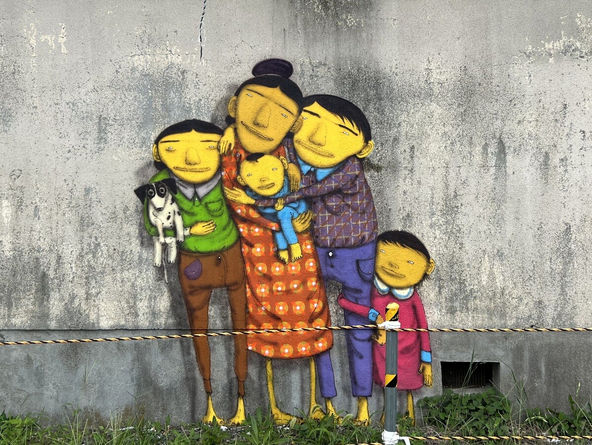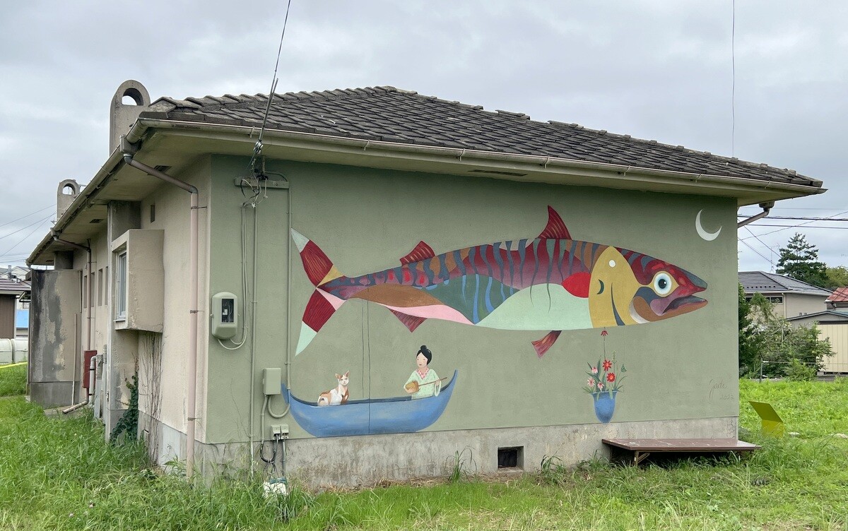オスジェメオス OSGEMEOS 氏は自分が担当した石巻中心市街地エリアで作品を制作した後、時間が余ったからと、この壁画を作成してくれたのだそう。