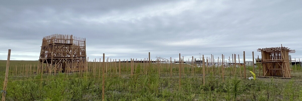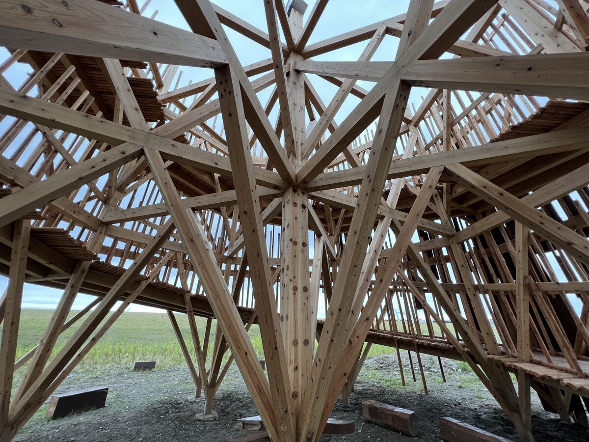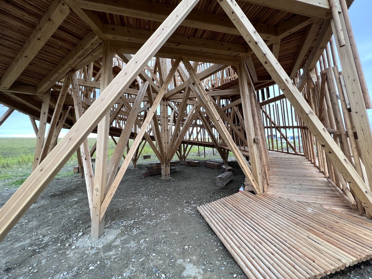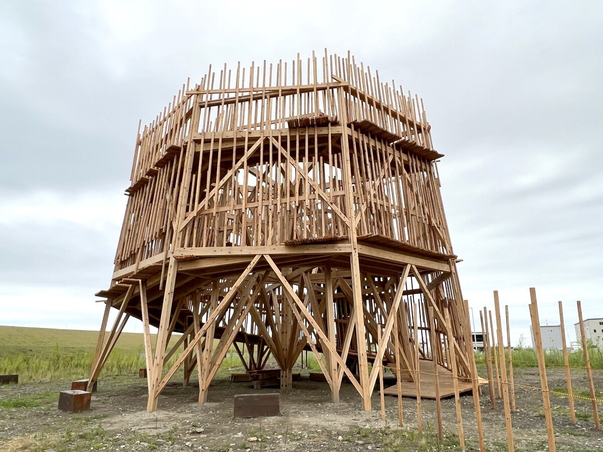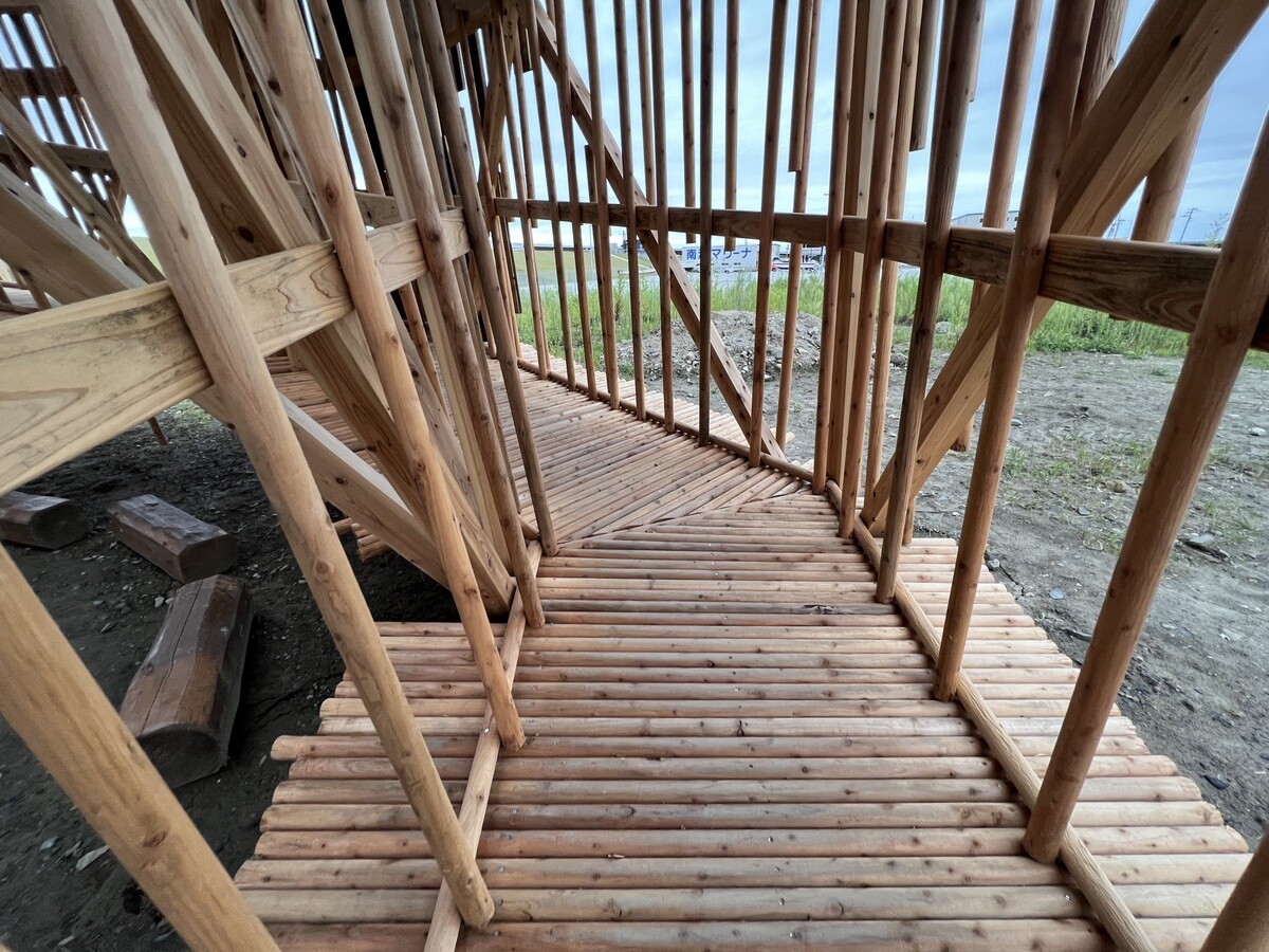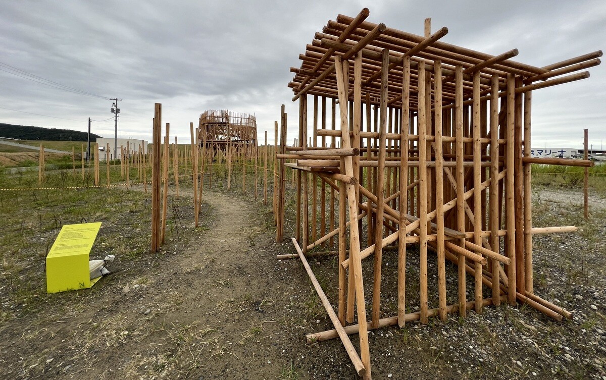 B9 川俣正 「石巻タワー」 同じく空き地に組まれた塔。未だ作り続け、7メートルの防潮堤を越えて海が見えるようにと、現在7.5メートルだが、より高くなるとのこと。会期中は、太陽光発電によって夜に明かりが灯る。
