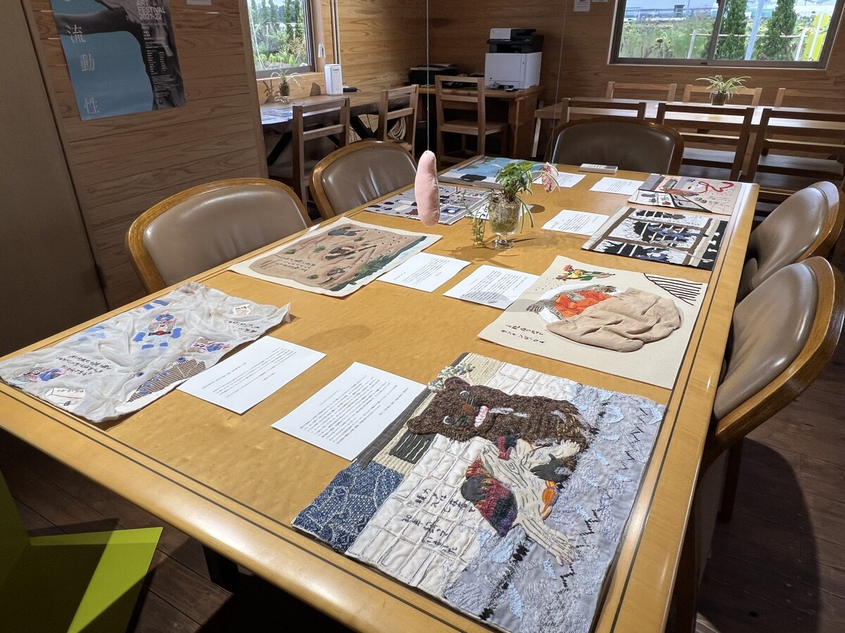 B6 弓指寛治「物語るテーブルランナー in こころの森」 弓指氏が、石巻の人々から聞いた話を紙にドローイングし、それを元に手芸でランチョンマットを制作。鴻池朋子氏が始めた「物語るテーブルランナー」プロジェクトを受け継いだとのこと。