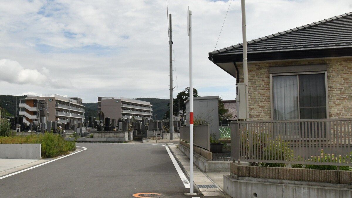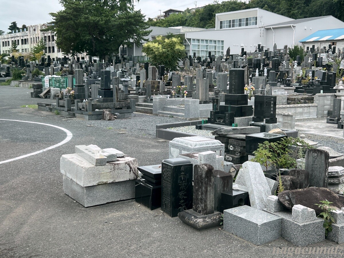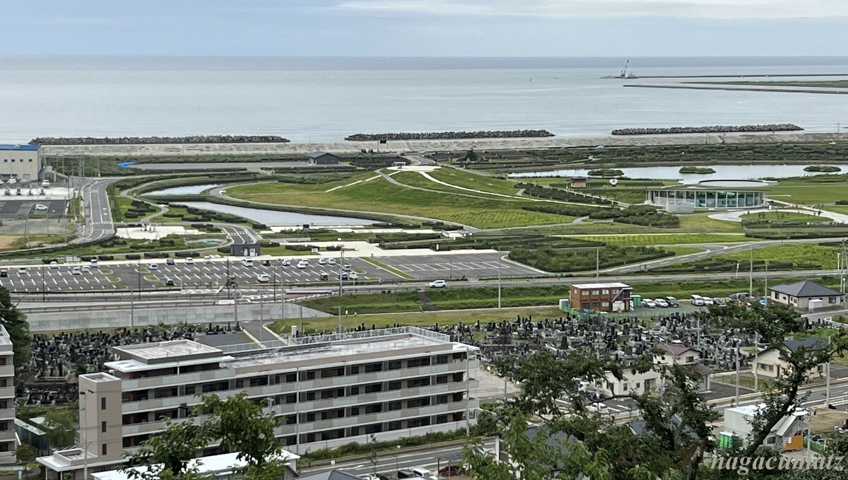 見下ろすと、今は大堤防が築かれ、みやぎ東日本大震災津波伝承館のある石巻南浜津波復興祈念公園の緑となっているが、公園の山側には、おびただしい数のお墓があるのがわかる。