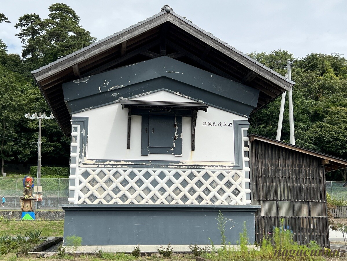石巻市は、東日本大震災の全浸水面積の13%にあたる73平方キロで、最大の被災地。石巻市だけで、死者3187名、行方不明者415名。蔵の右側の白い壁の上の方に、津波の高さが記載されており、内部には震災の資料や、蔵にあった家人の物などが展示されている。