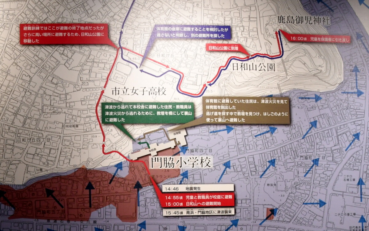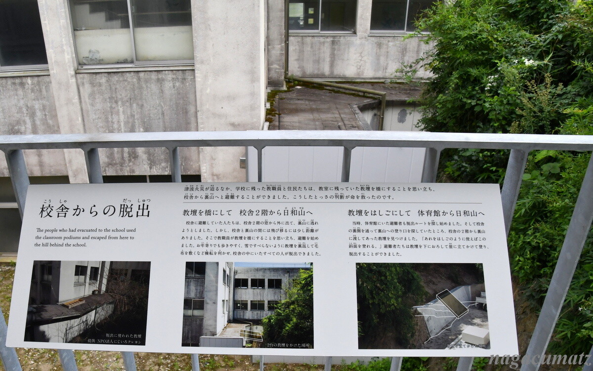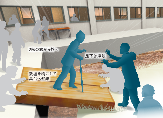 校舎に避難していたものの、津波が迫る為、校舎二階の窓から教壇を橋のように立てかけて、裏山に逃げたとのこと。(画像をクリックすると拡大されます)