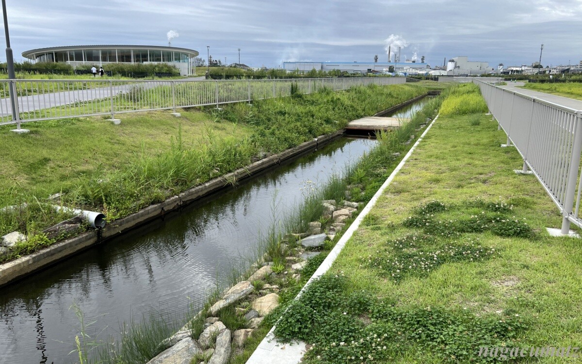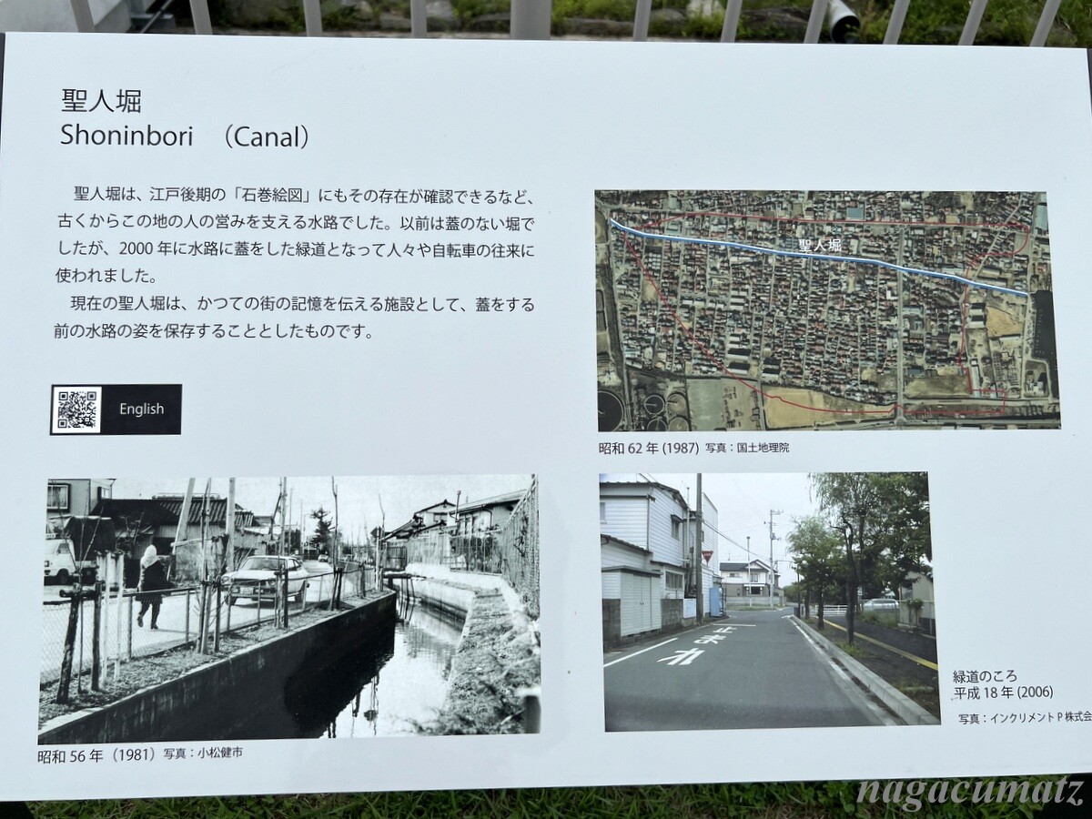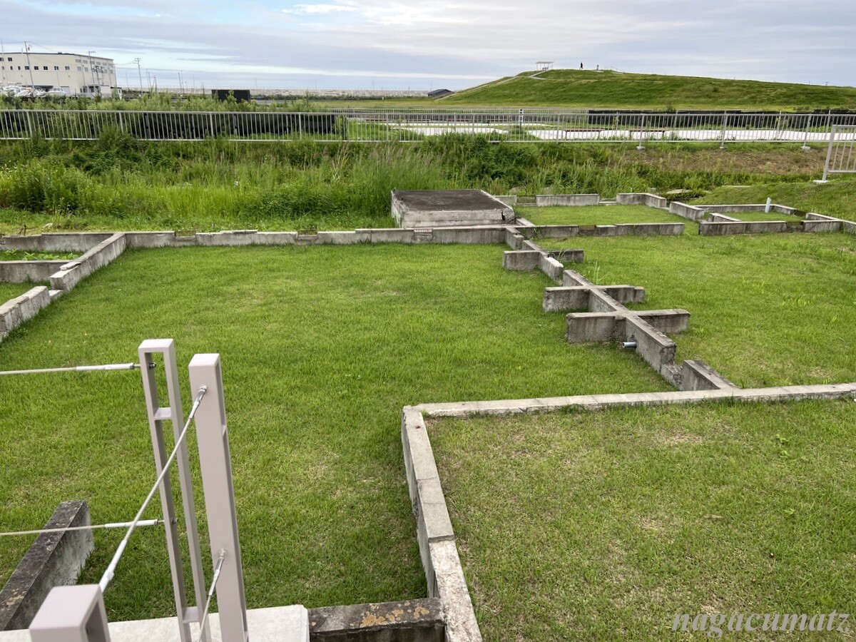 広い広い石巻南浜津波復興祈念公園だが、そこは以前は住宅が普通にあった所。聖人堀なる水路。左上の建物は、みやぎ東日本大震災津波伝承館。聖人堀よりも海側は、江戸時代までは潟と砂浜が広がり、誰も住んでいないエリアだったが、開墾されて桑畑・果樹園・水田になり、高度経済成長期に住宅地として開発され、1977年に住宅街が形成された。