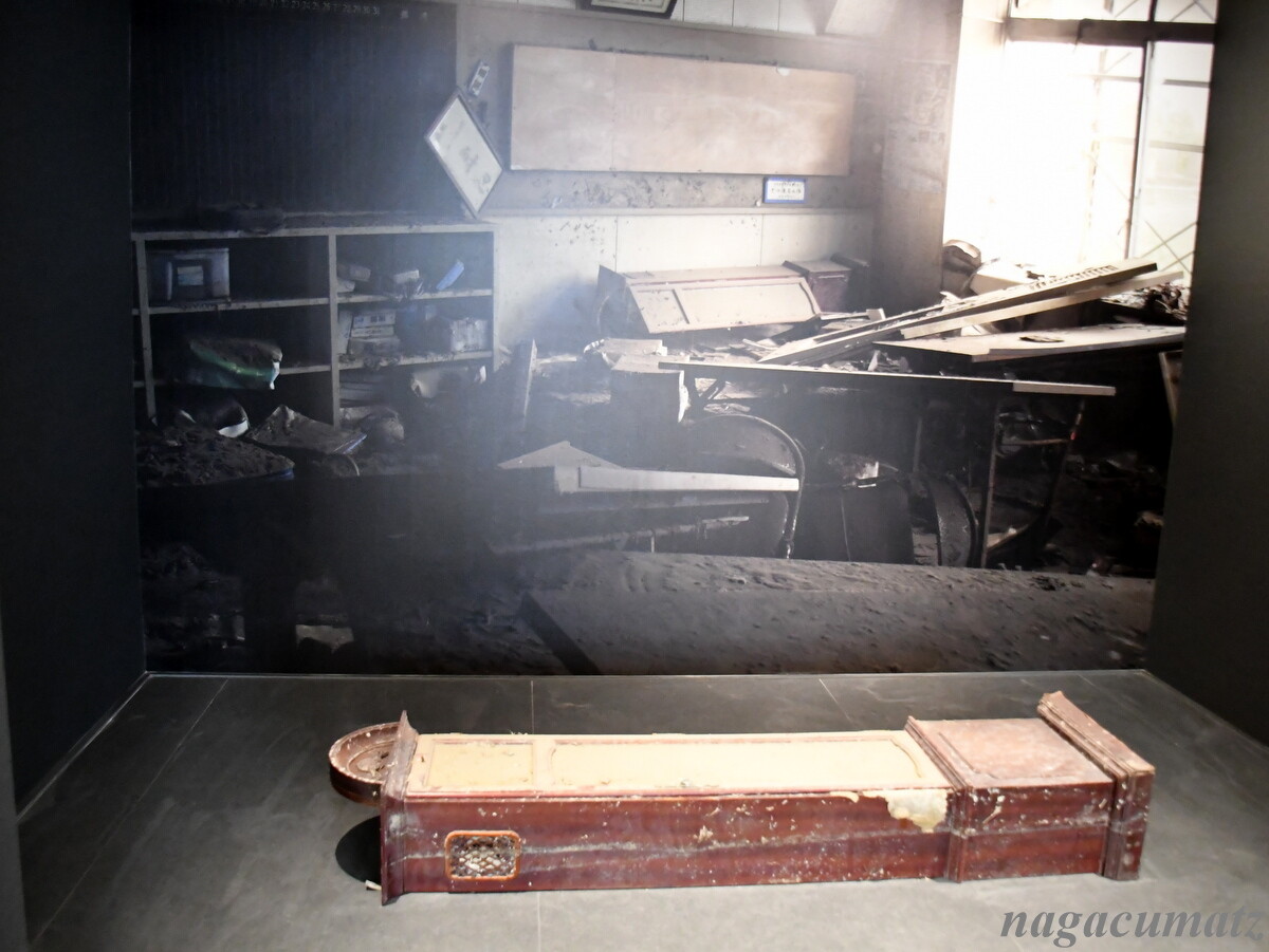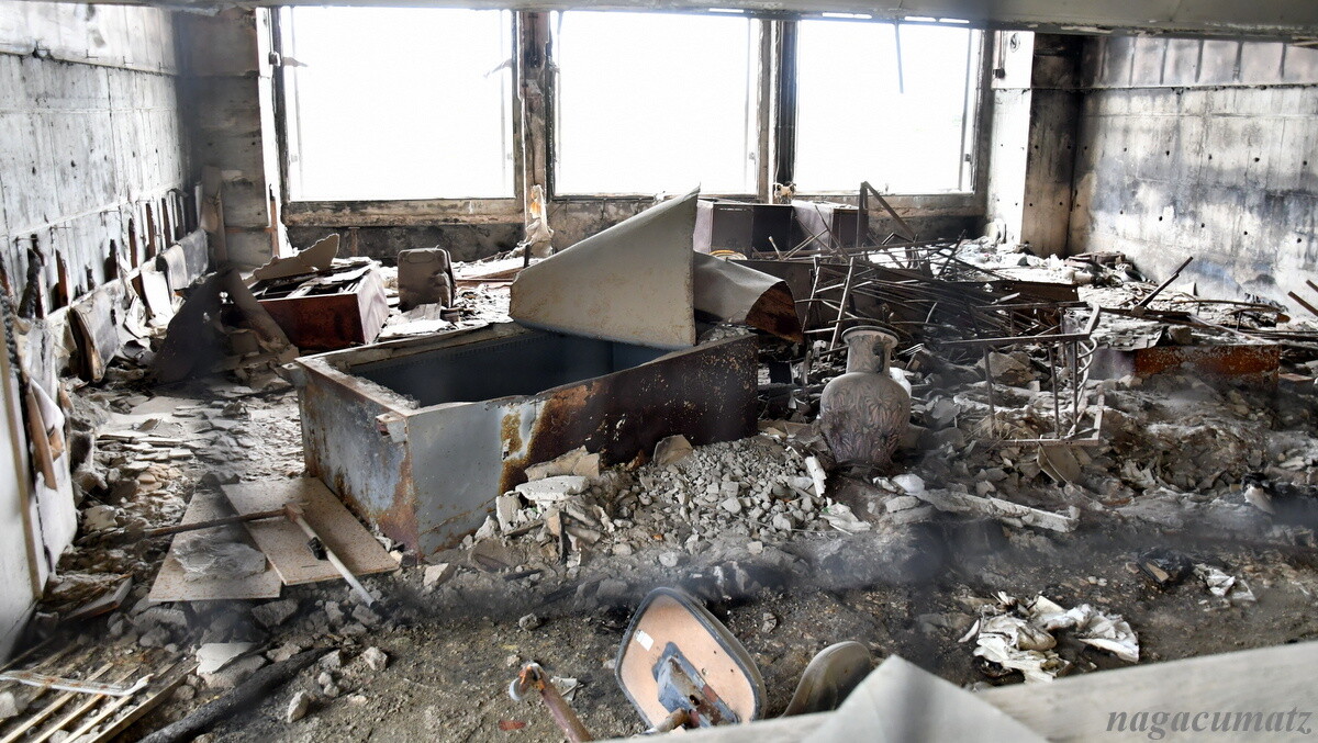 校長室。横倒しになっているのは金庫で、奇跡的に浸水を免れた。1週間後にひかえていた卒業式の為に保管されていた卒業証書を、4月になって渡すことが出来たのだそう。