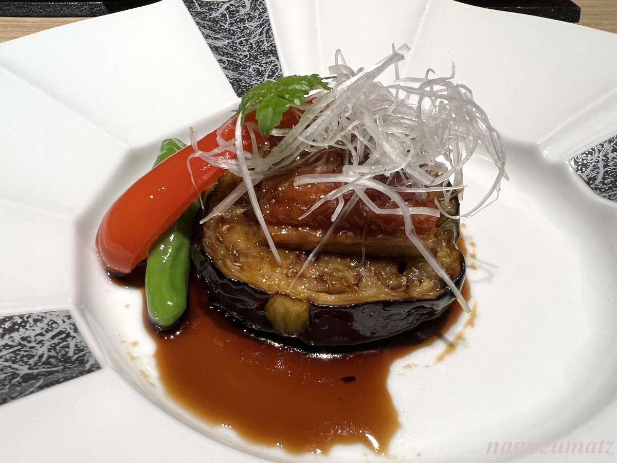 温の物 米茄子ステーキの鰻のせ 青唐辛子、パプリカなどが付く。結構しっかりした味付けかな。