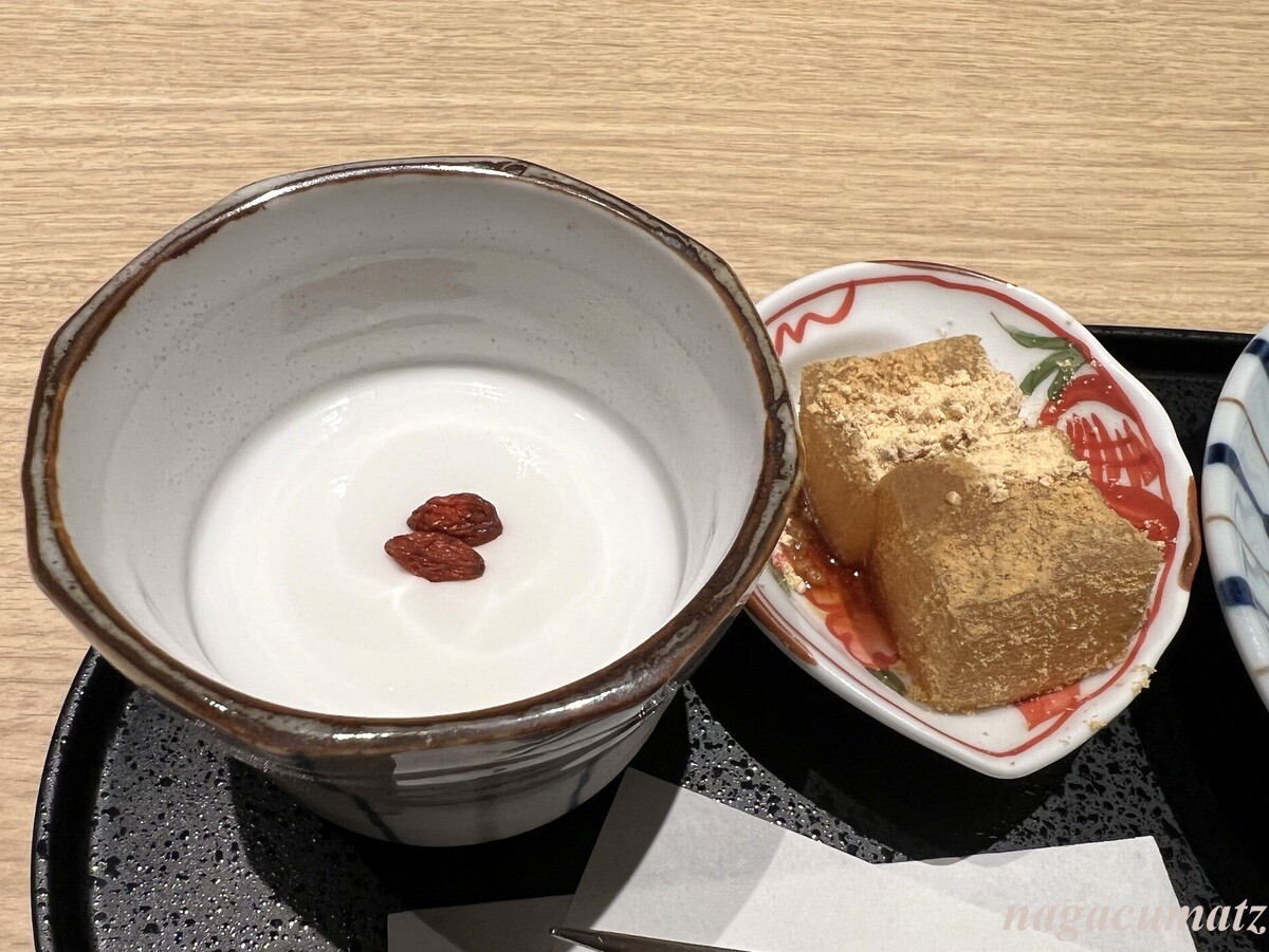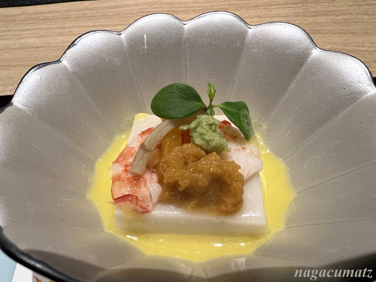 先付 季節豆腐、コーンスープ掛け、車海老、しめじ、赤黄パプリカ、生雲丹