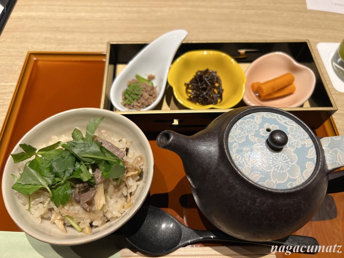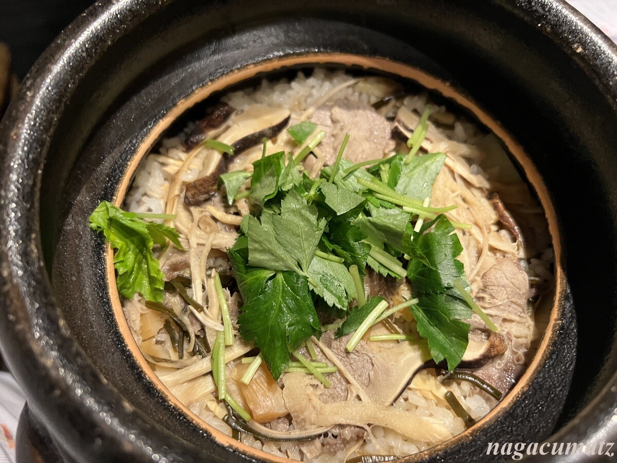 食事は、黒毛和牛ロースと氷温熟成フィレの松茸釜飯 ひつまぶし風 貝柱、竹の子、三つ葉